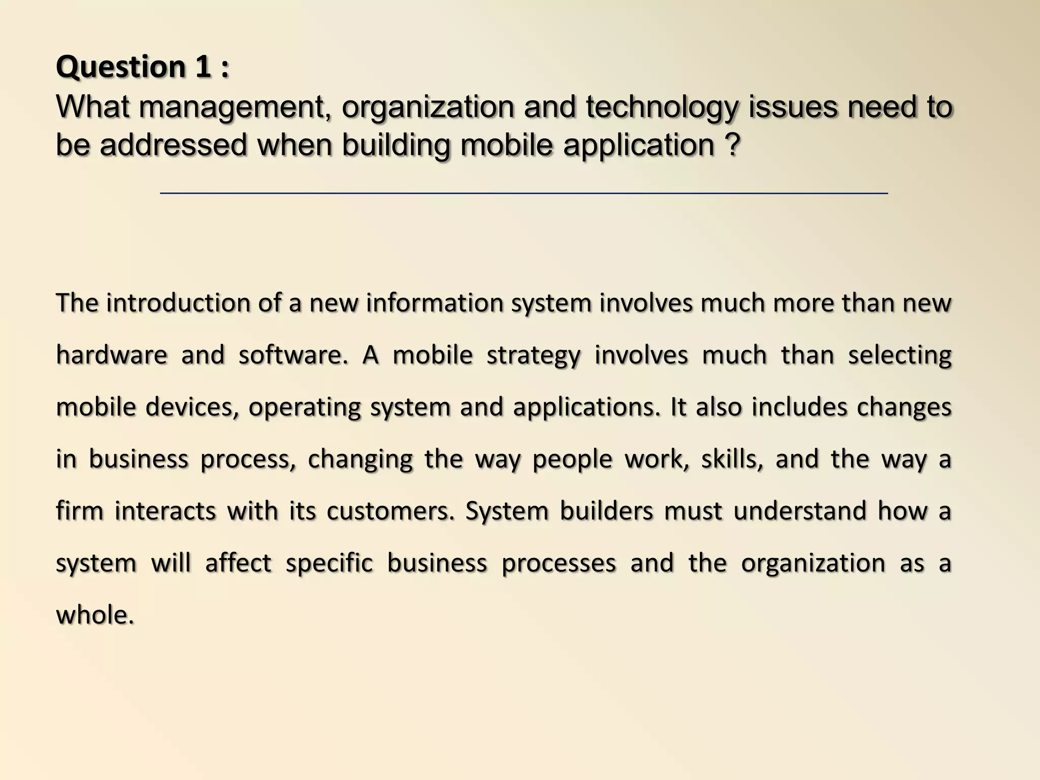 The document discusses management, organizational, and technological issues related to building mobile applications. It provides examples of how three companies - Decker Corporation, USAA, and Ryland Homes - addressed these issues and benefited from developing mobile apps. USAA in particular changed its business processes through mobile apps that allowed accident claims submission with photos, mobile check deposits, and access to loan/policy information. The document emphasizes that effective mobile strategies require examining business processes, selecting appropriate devices/software, monitoring usage, and retraining employees on new workflows.
