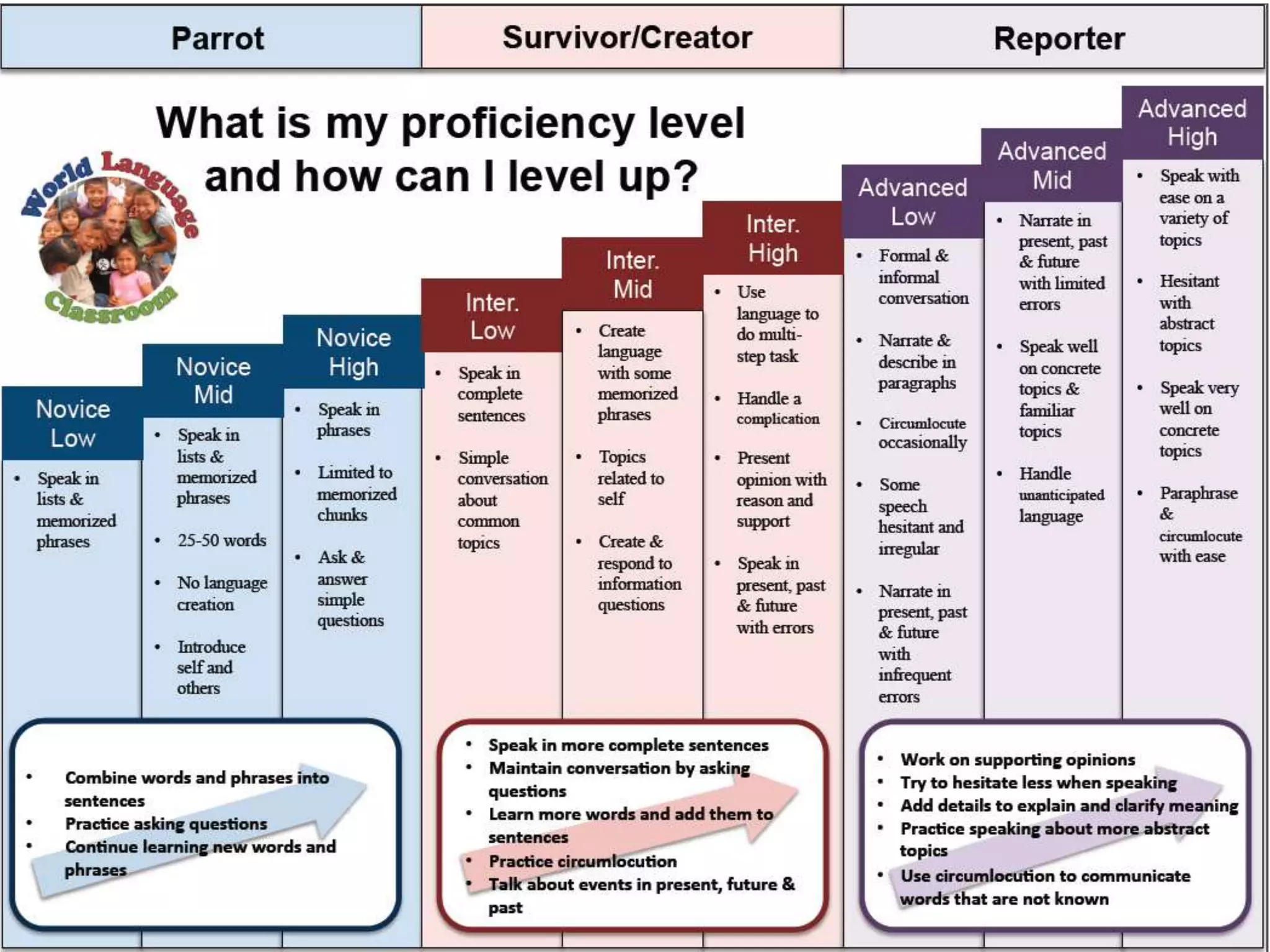 The document outlines the ACTFL proficiency levels for foreign language learners, detailing language output expectations from novice to advanced levels. It provides strategies for students to advance their skills, such as combining words into sentences and practicing circumlocution. Additionally, resources and tips are suggested to help students communicate more confidently as they improve their proficiency.