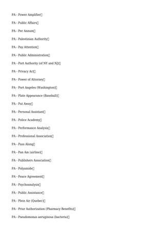 The document explains the concept of estate planning, emphasizing the importance of personalized legal tools to meet individual needs and desires. It also provides a detailed list of various meanings for the acronym 'pa', including its interpretations in legal, medical, and other contexts. Notably, 'pa' can signify 'professional association' for attorneys and 'physician assistant' for medical professionals, among numerous other definitions.