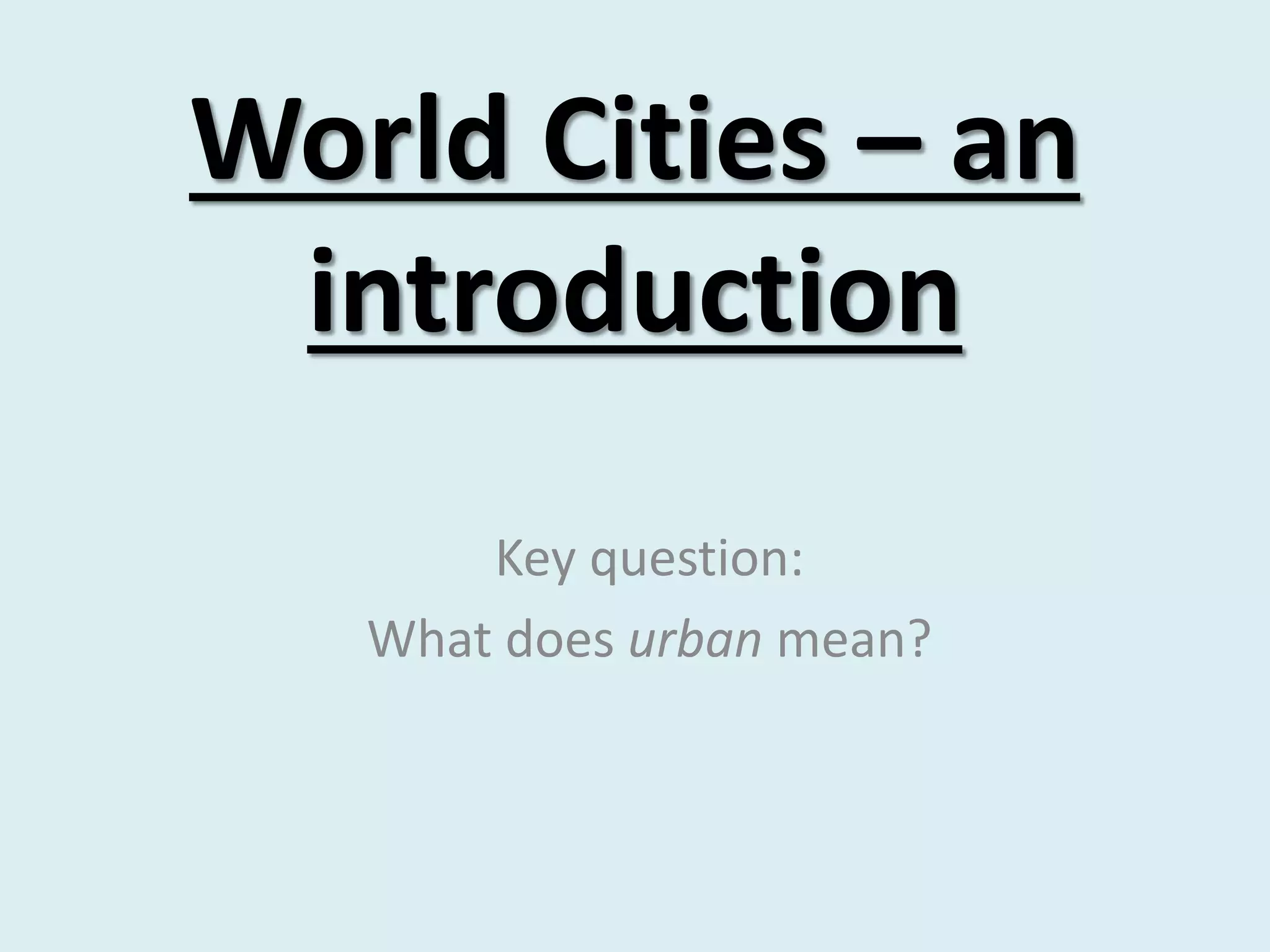This document discusses definitions of urban and rural areas. It explores some key differences such as size, functions, employment, density, and administration. Several countries' criteria for defining urban populations are presented based on factors like population size, employment levels, housing density. Defining towns and cities can vary between countries as there is no agreed international definition. Delineating urban areas can also differ depending on if one considers the core city, greater metropolitan area, or full region. Overall the document examines how urban and rural are defined and some challenges around classifying areas.