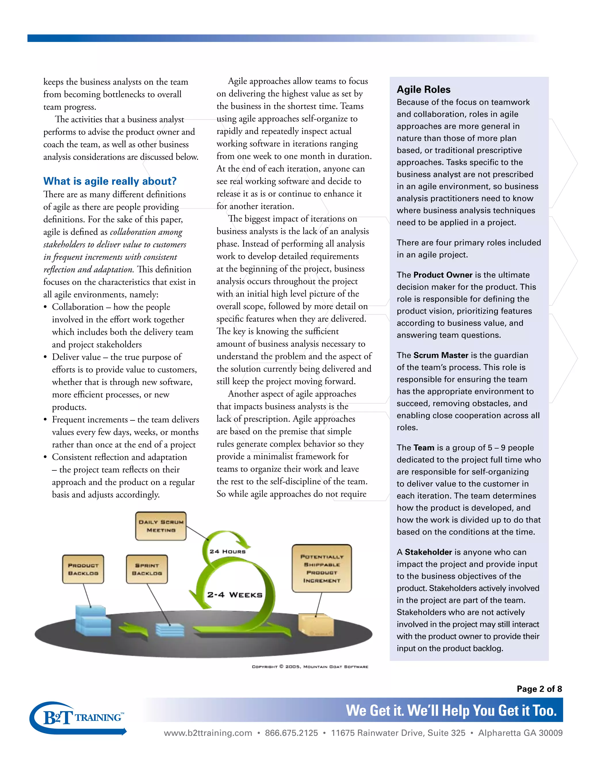 2) The business analyst adopts two main roles: business advisor to support the product owner, and business coach to help other team members improve their analysis skills.