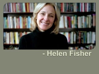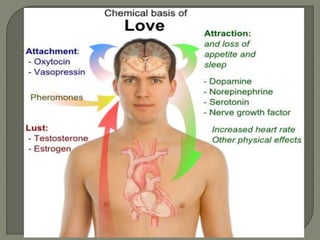 The document discusses the three stages of love: lust, attraction, and attachment. Lust is driven by sex hormones like testosterone and estrogen. Attraction involves neurotransmitters in the brain like dopamine, norepinephrine, and serotonin and is described as the "love struck" phase. Attachment occurs when the couple decides to continue the relationship and make long-term commitments, which can lead to raising a family together. Special hormones like oxytocin and vasopressin are secreted during attachment to promote intimacy and long-term relationships.