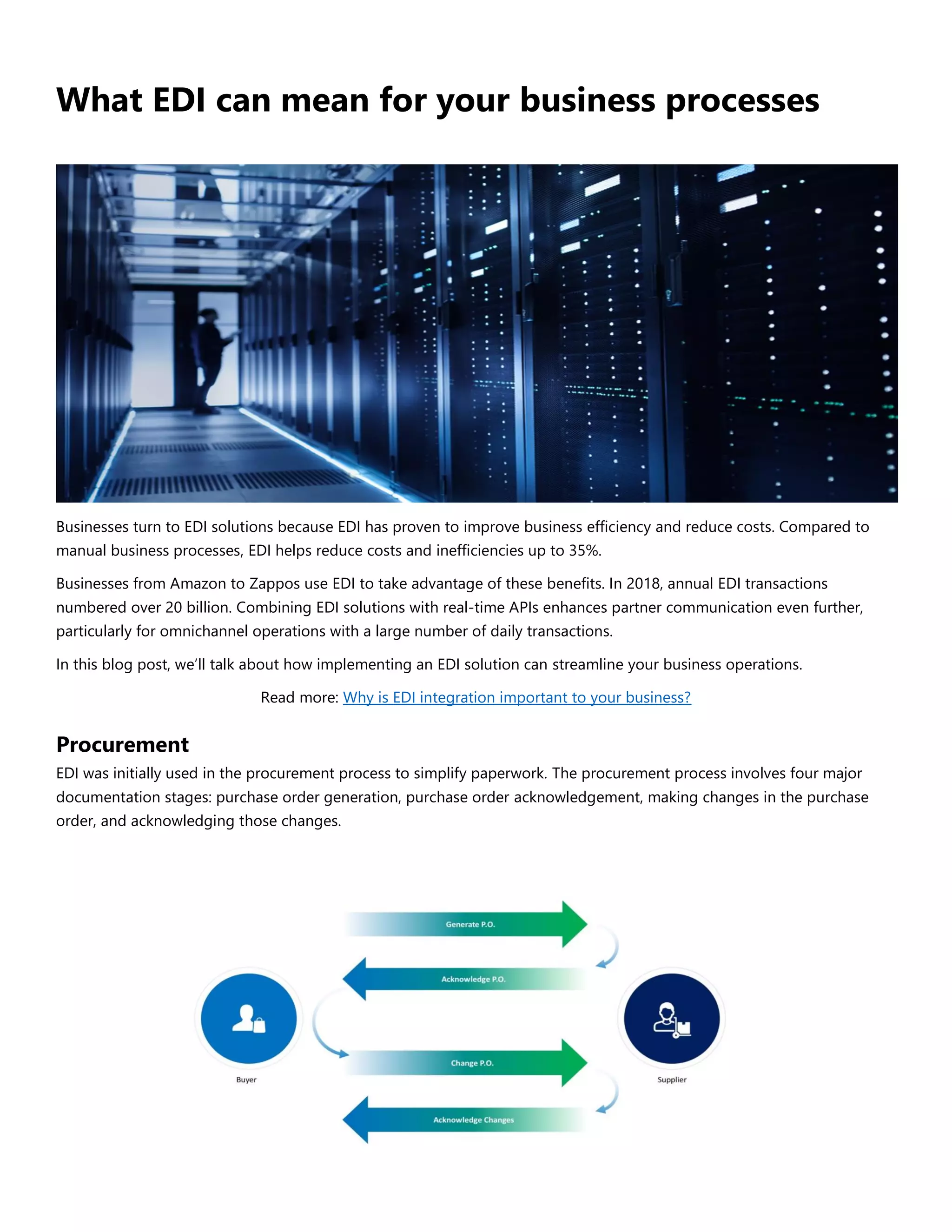 EDI solutions improve business efficiency and reduce costs by automating processes such as procurement and invoicing, with businesses reporting up to 35% cost savings. The technology enhances supply chain operations through improved tracking and traceability, and is increasingly mandated by governments to reduce paper usage. Overall, a well-integrated EDI system supports better decision-making, cash management, and environmental compliance.
