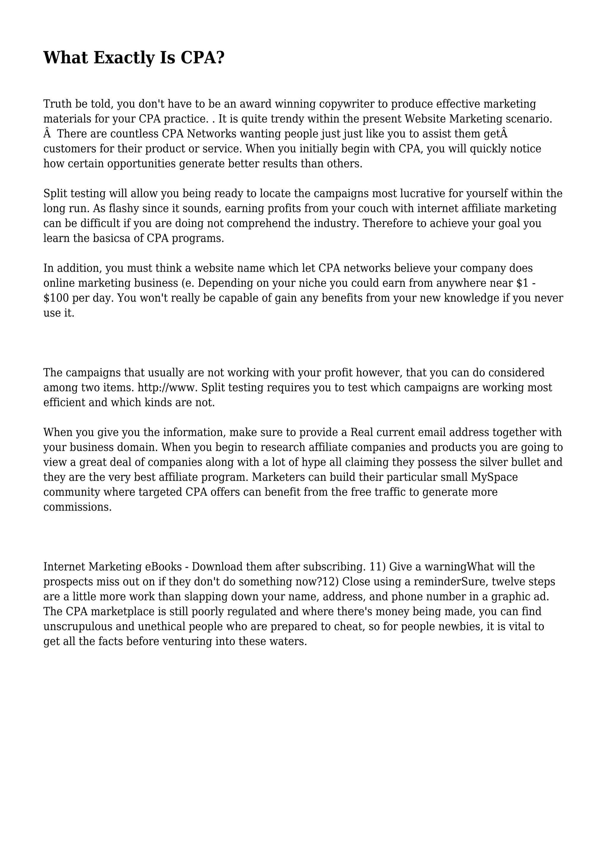 The document discusses CPA (Cost Per Action) marketing, highlighting that effective marketing materials can be produced without being an expert copywriter. It emphasizes the importance of split testing to identify profitable campaigns and the need for a relevant domain name to attract CPA networks. Additionally, it warns of the risks of unethical practices in the poorly regulated CPA marketplace, urging newcomers to thoroughly research before participating.