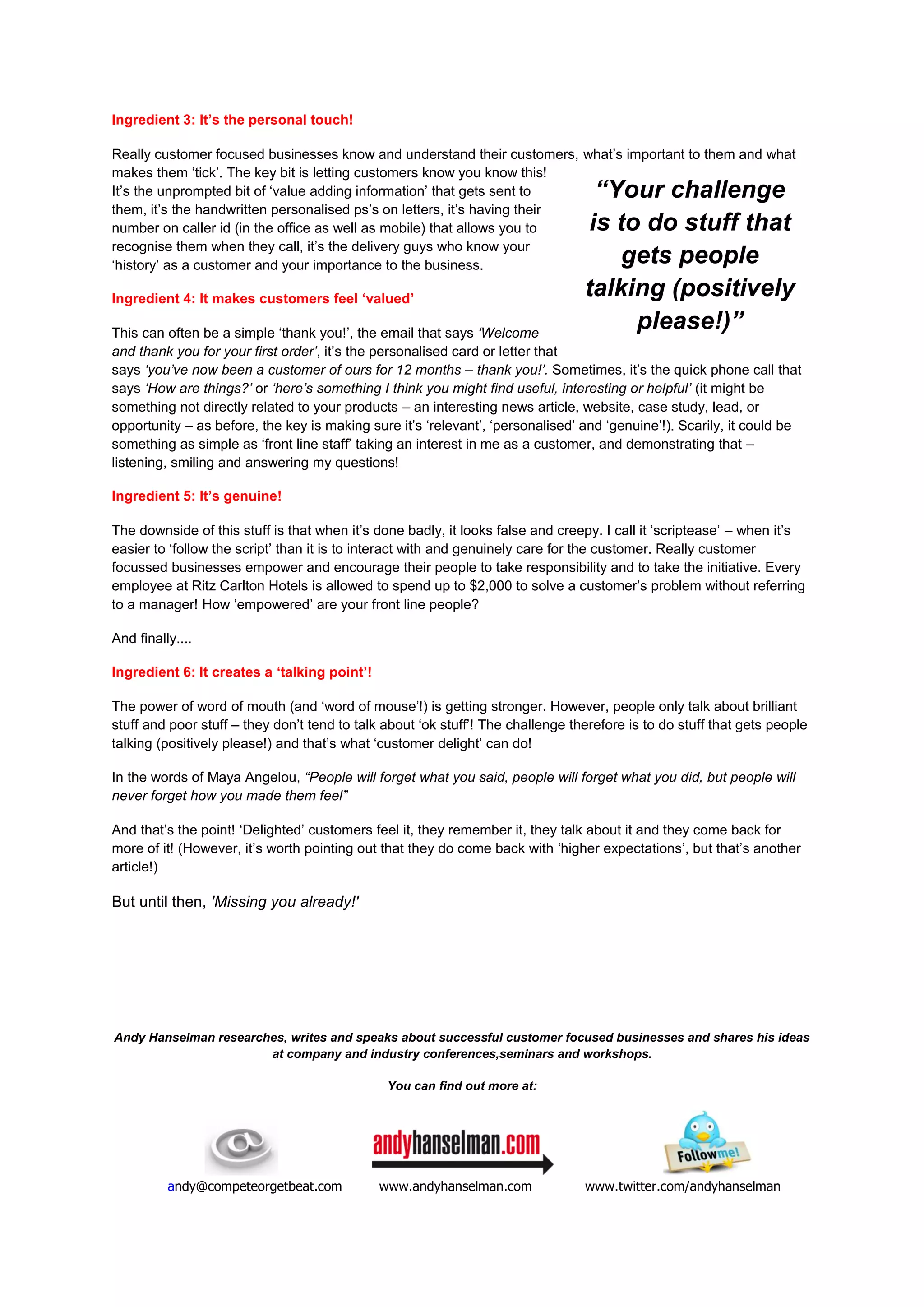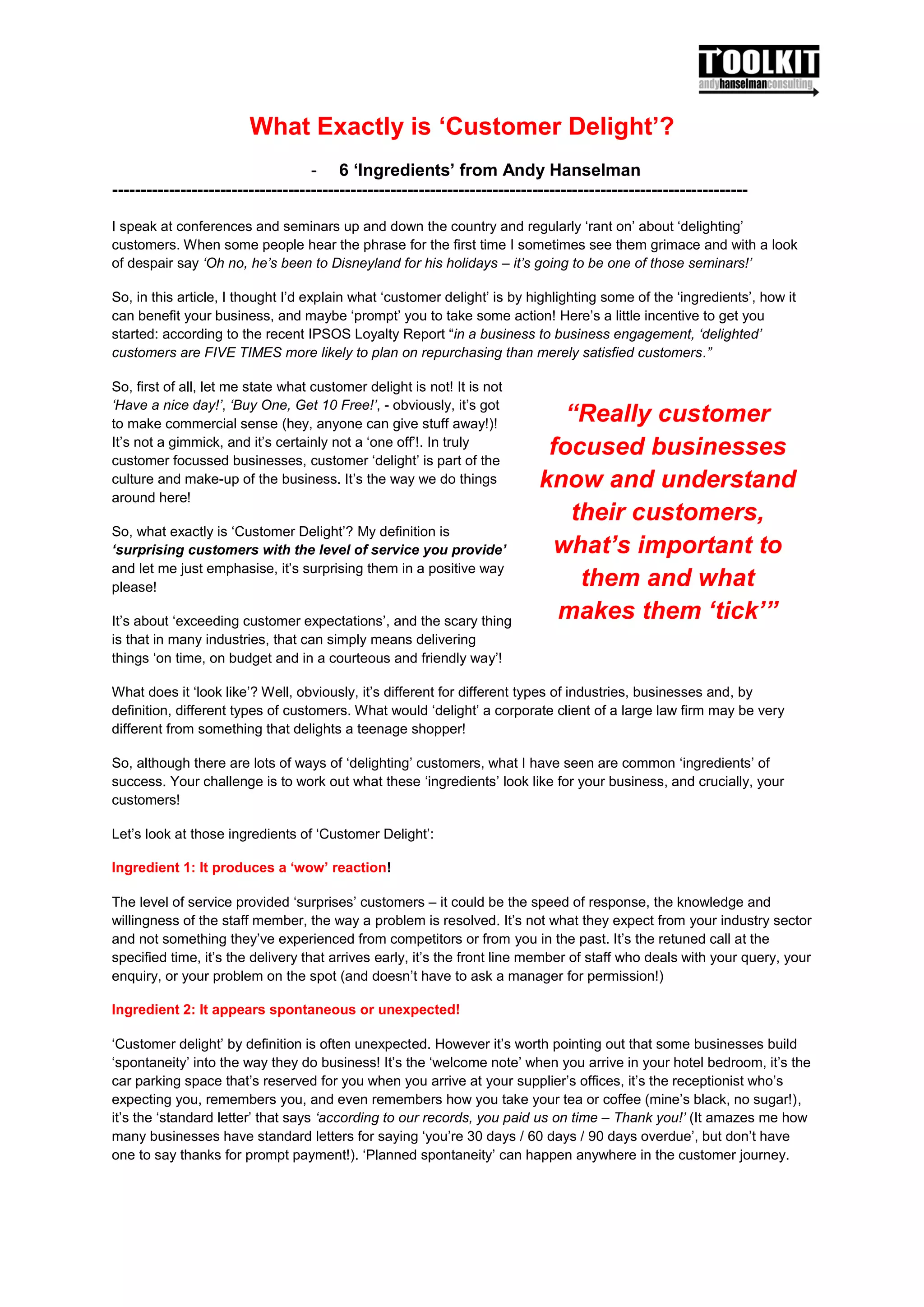 The document discusses 6 key "ingredients" to customer delight: 1) Producing a "wow" reaction through exceeding expectations. 2) Appearing spontaneous or unexpected. 3) Providing a personal touch by knowing and understanding customers. 4) Making customers feel valued through personalized gestures. 5) Being genuine rather than scripted. 6) Creating positive word-of-mouth by doing things that get people talking. Customer delight involves surprising customers in a positive way through exceptional service, building spontaneity into interactions, and empowering front-line employees to solve problems.