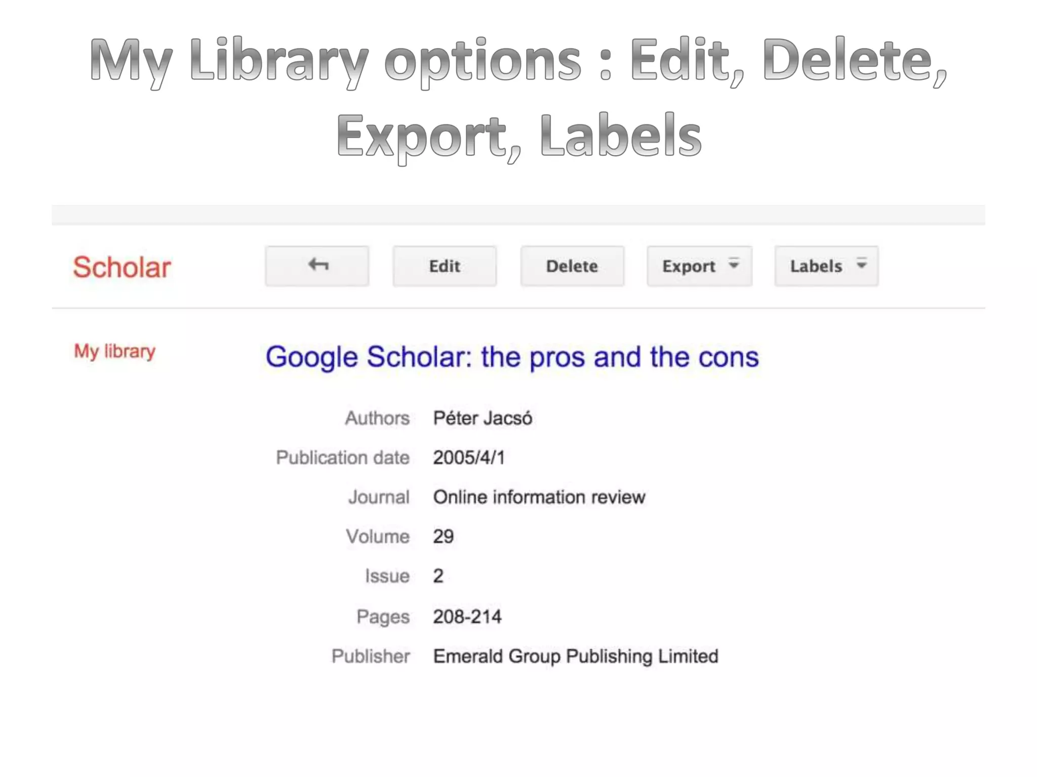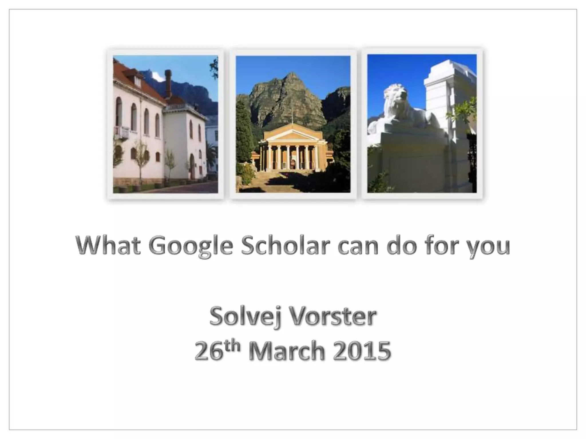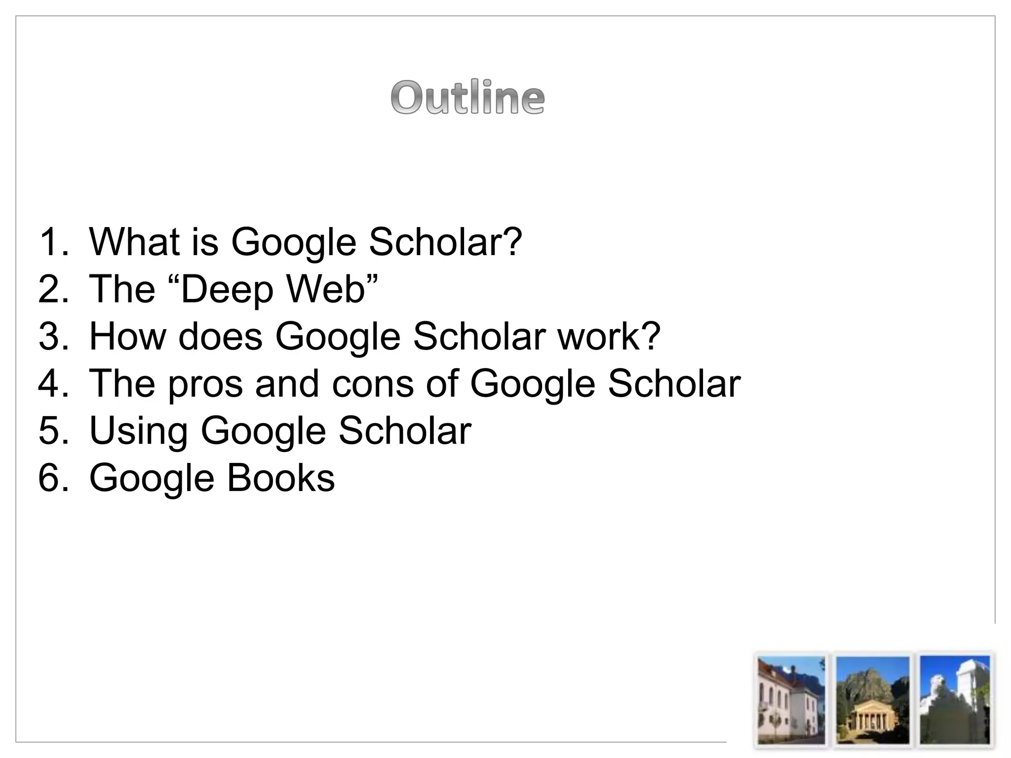 This document provides an overview of Google Scholar, including what it is, how it works, its pros and cons, and how to use it. Some key points: