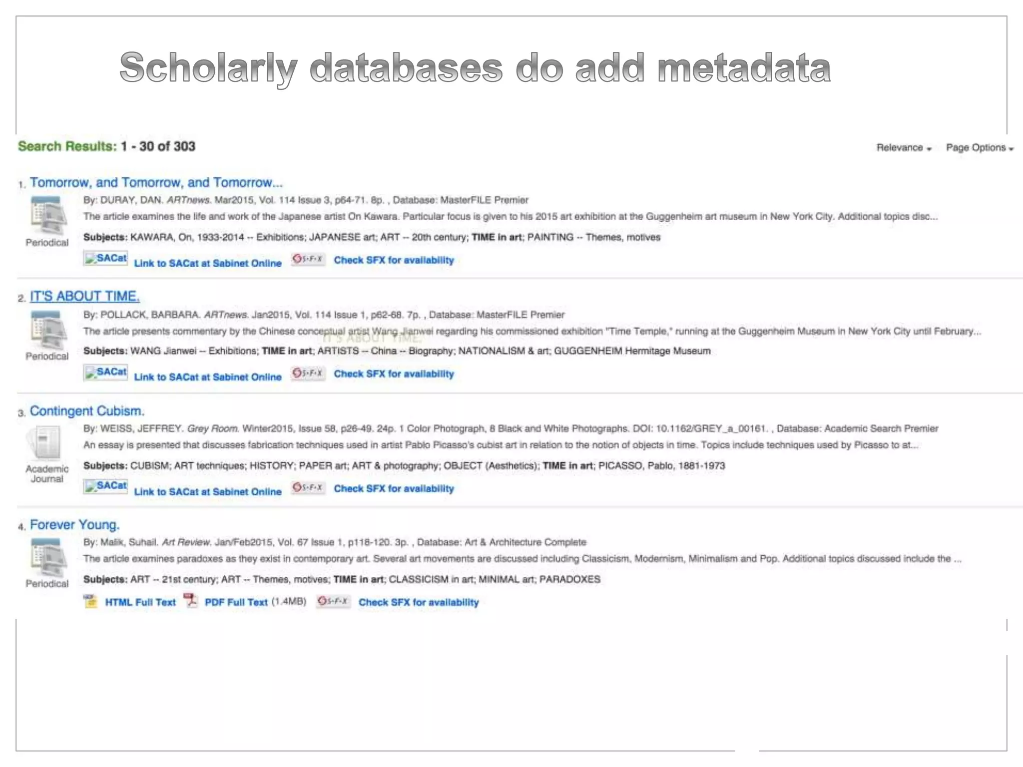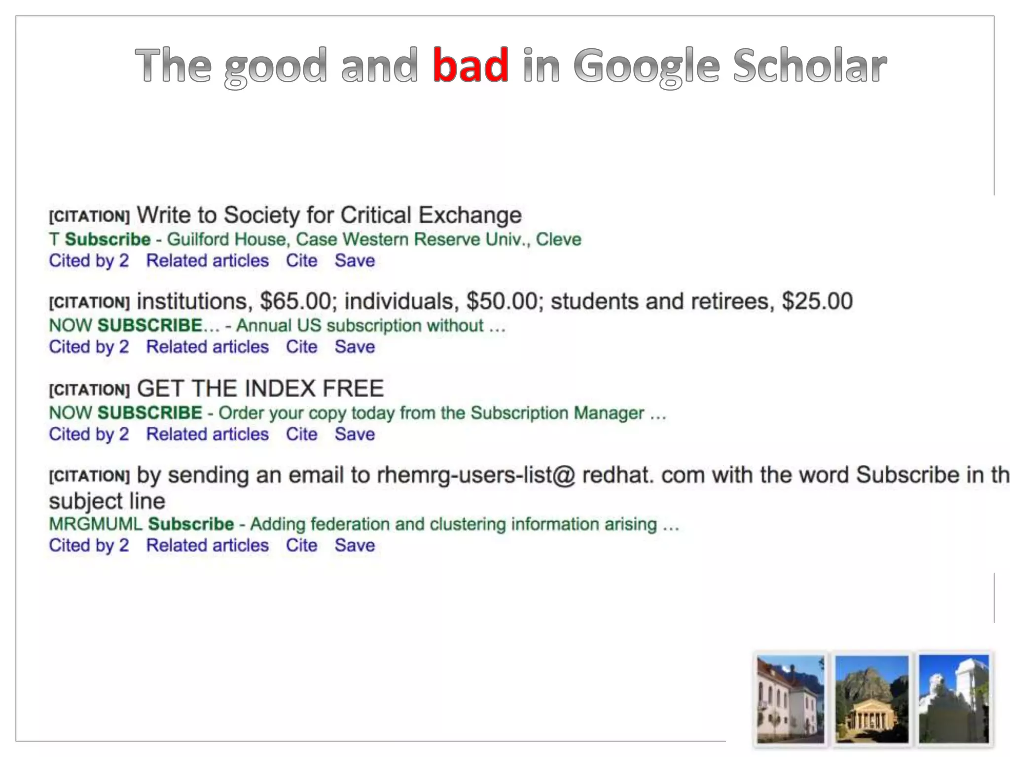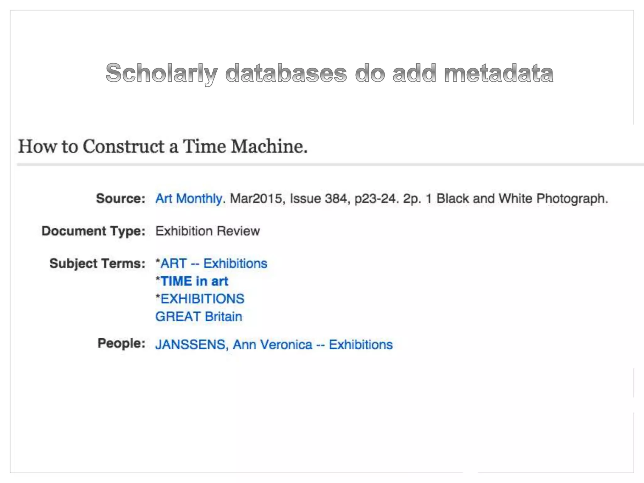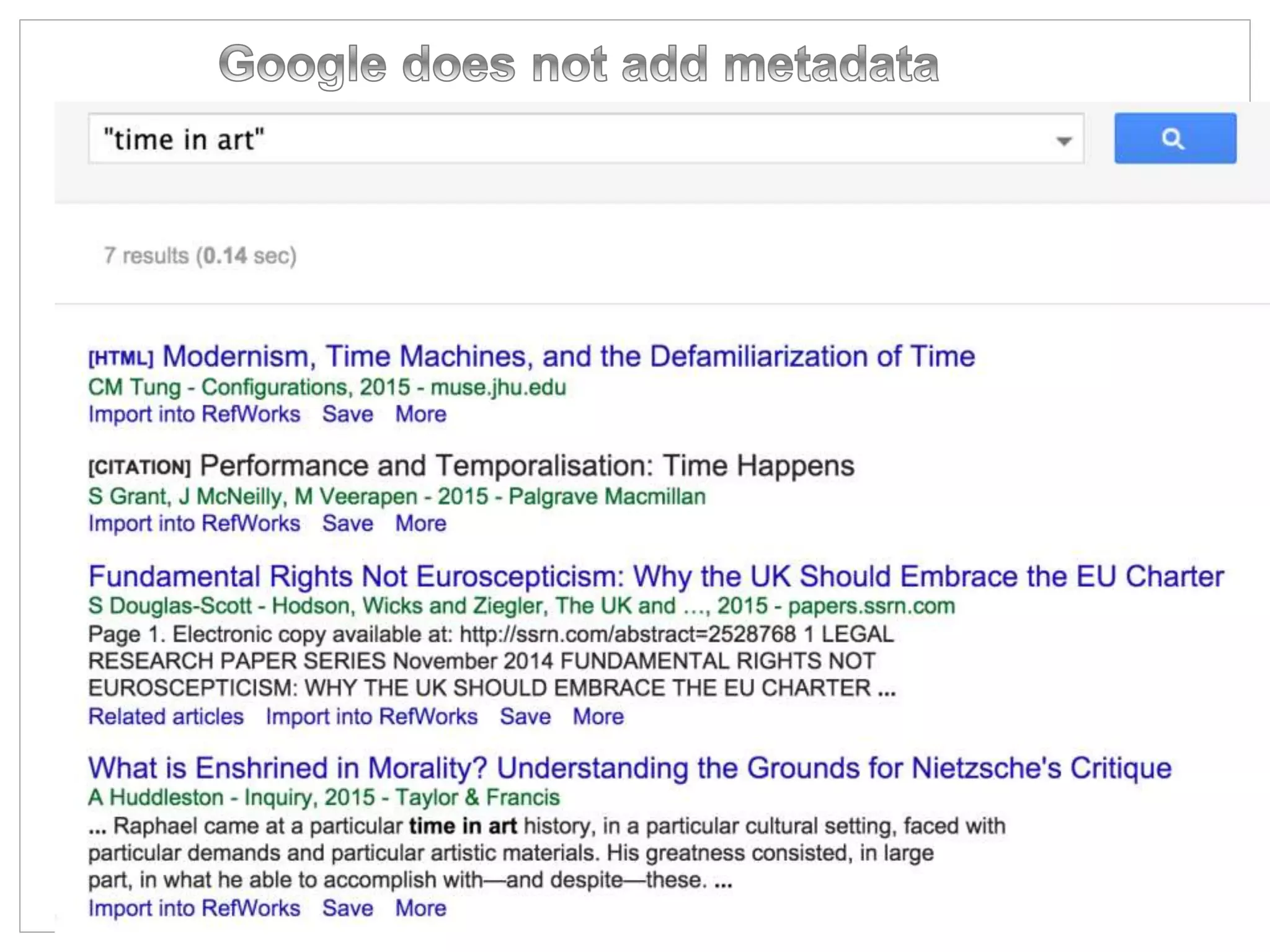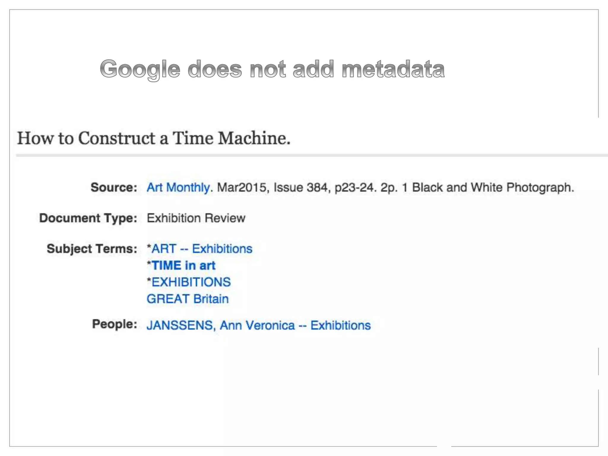 - It has limitations in what is included from certain publishers, material only in print, and content in the "Deep Web." Advanced searching options are also limited.