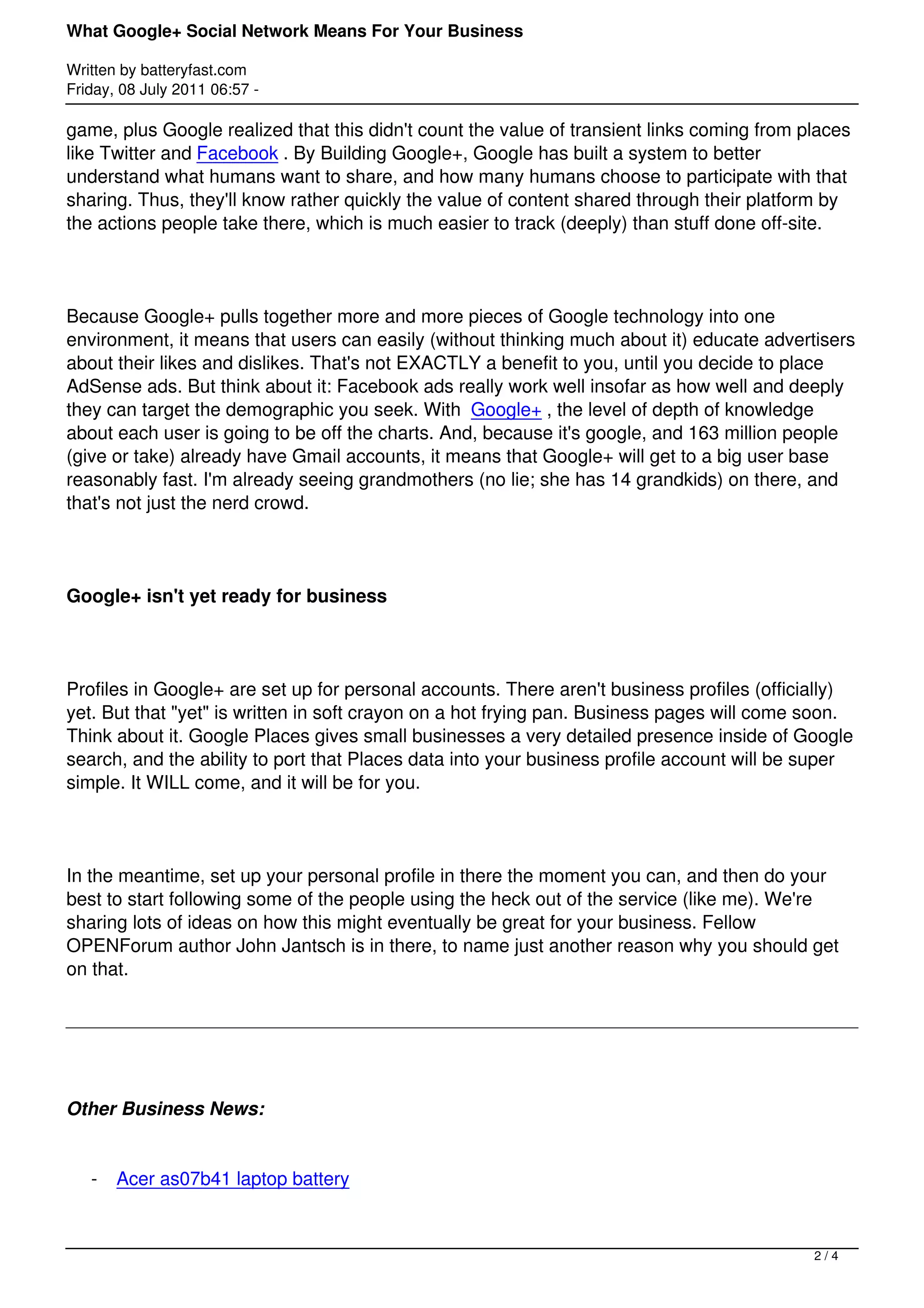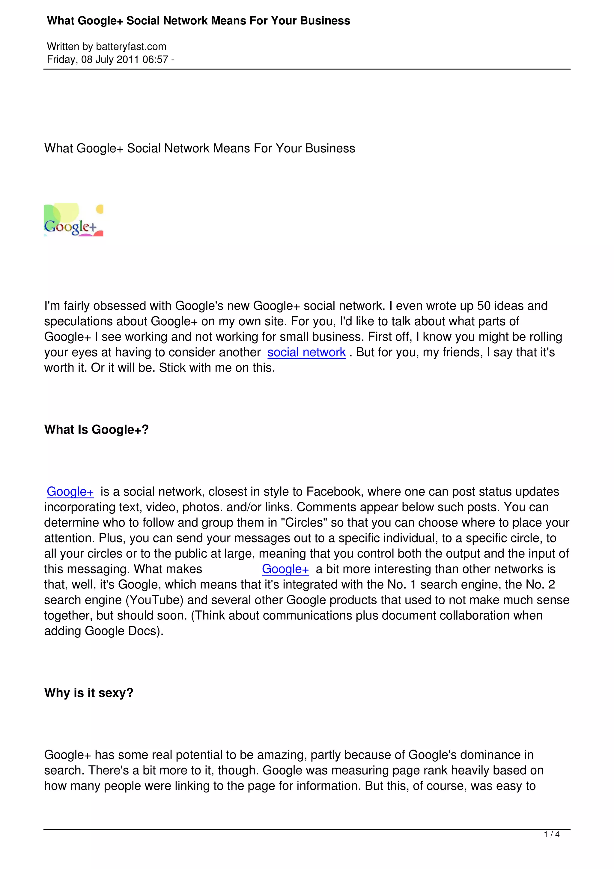 The document discusses the potential impact of Google+ as a social network for small businesses, highlighting its integration with other Google products and its ability to collect user data for targeted advertising. Google+ allows users to connect with others and control their messaging while emphasizing the importance of establishing a presence on the platform despite the current lack of official business profiles. The author encourages businesses to create personal profiles and engage with the community to prepare for future opportunities on Google+.