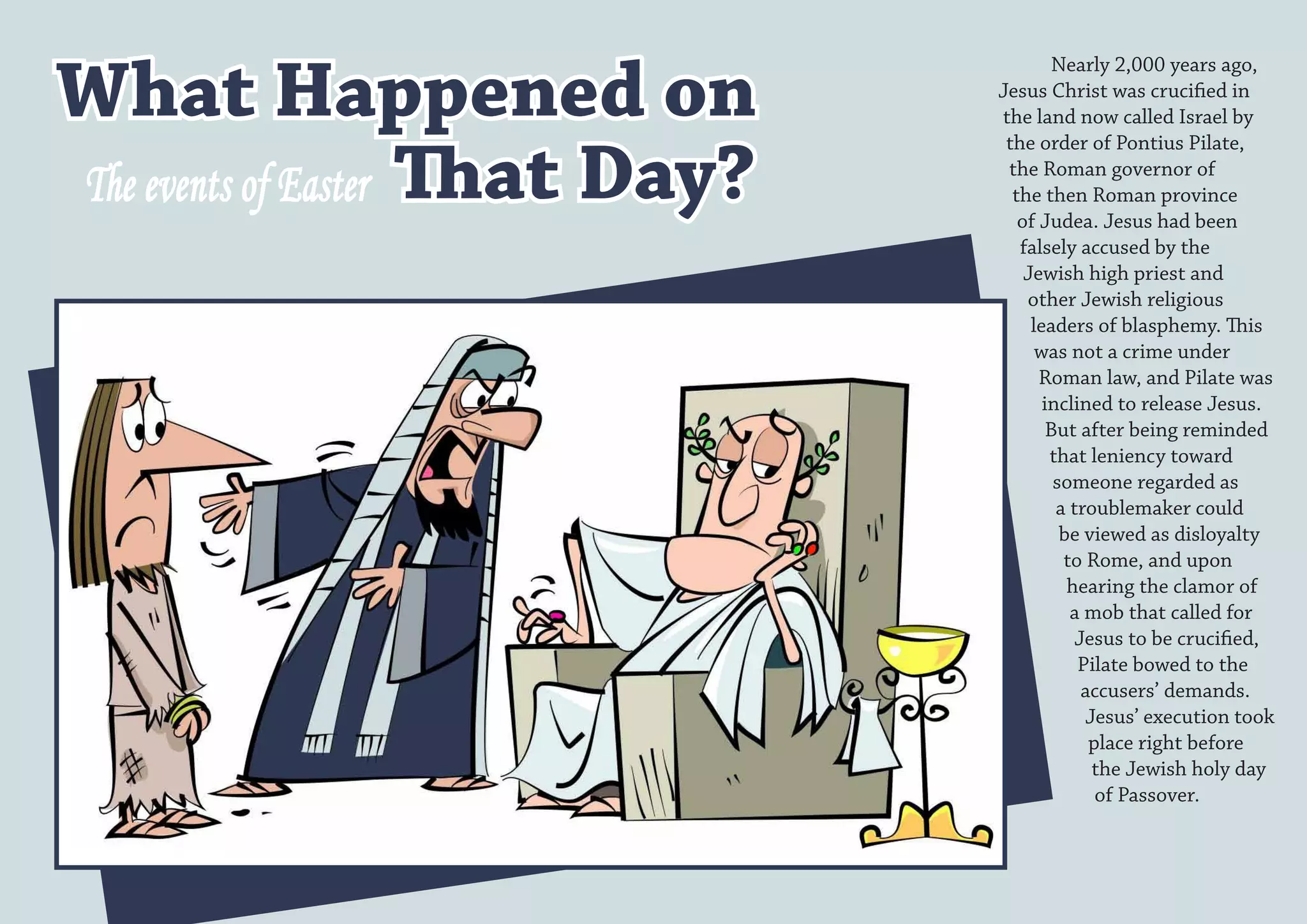 Jesus was crucified around 2000 years ago in Israel on the orders of Pontius Pilate, the Roman governor. He was falsely accused of blasphemy by Jewish religious leaders. After his death, some of his followers reported that he had appeared to them alive after three days, believing he had risen from the dead as the Messiah.