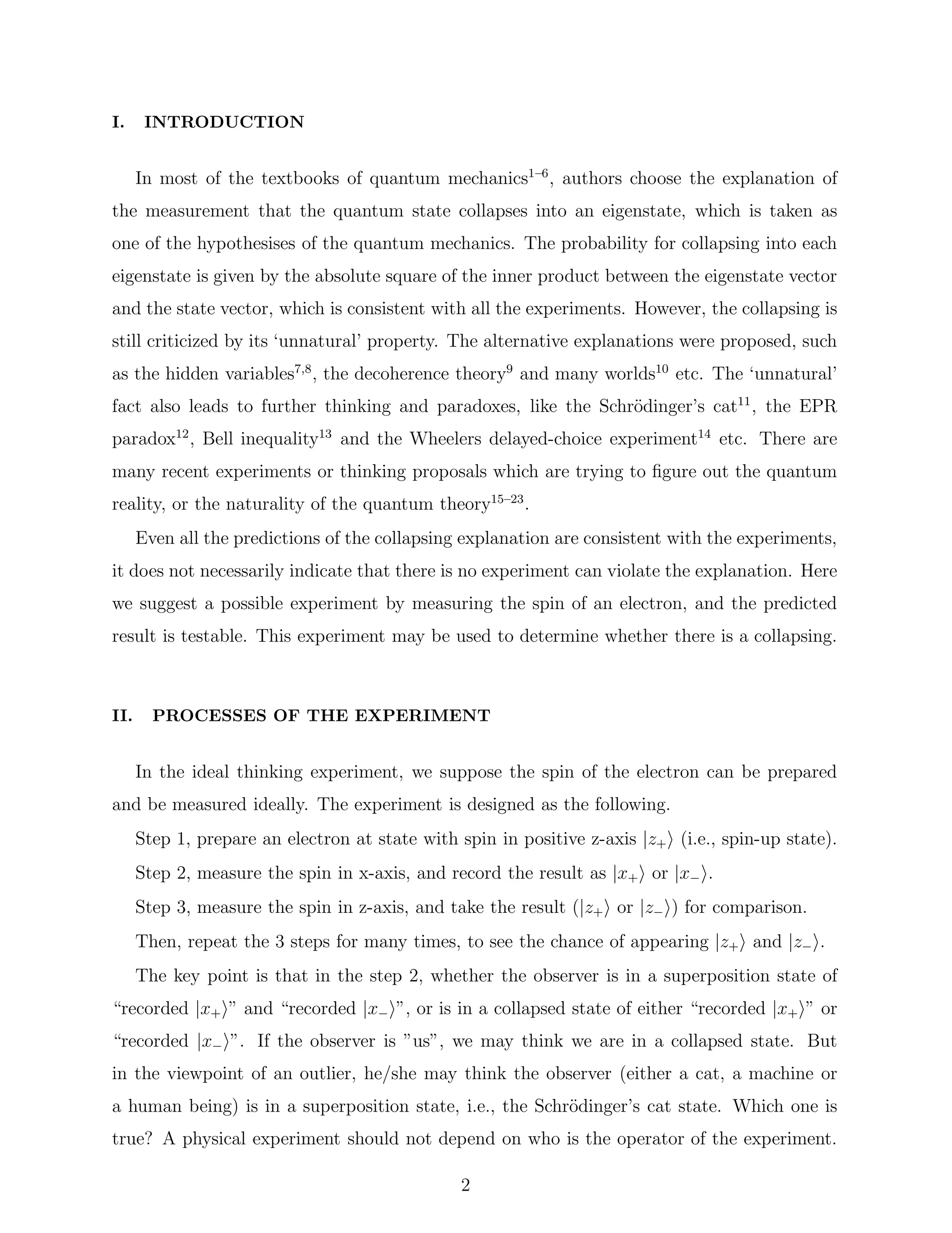 The document proposes a thought experiment to investigate whether the quantum state of an electron collapses upon measurement, specifically assessing the outcomes of measuring its spin along the x-axis followed by the z-axis. Two experimental versions are considered, one from the perspective of the observer (Alice) who perceives a collapse, and another from an external observer (Bob) who sees a superposition, predicting different results. Future experiments are anticipated to clarify which viewpoint holds true regarding quantum state behavior and measurement.
