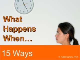 The document discusses various scenarios related to changes in technology and business models, posing the question "What Happens When..." for each one. Some scenarios discussed include what happens when marketing moves away from traditional channels, when organizational barriers are removed, and when the consumption of a product or service increases its value.