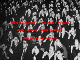 The document summarizes the filmmaker's process of gathering audience feedback at different stages of production to inform changes made to their film. This included conducting questionnaires, focus groups, and surveys before and after screenings to understand preferences around genre, plot, character representation, and pacing of scenes. Feedback indicated a preference for comedy elements and relevance, leading the filmmaker to incorporate more comedy and contextual details. Additional footage was later added to a walking sequence based on feedback that it was too short.