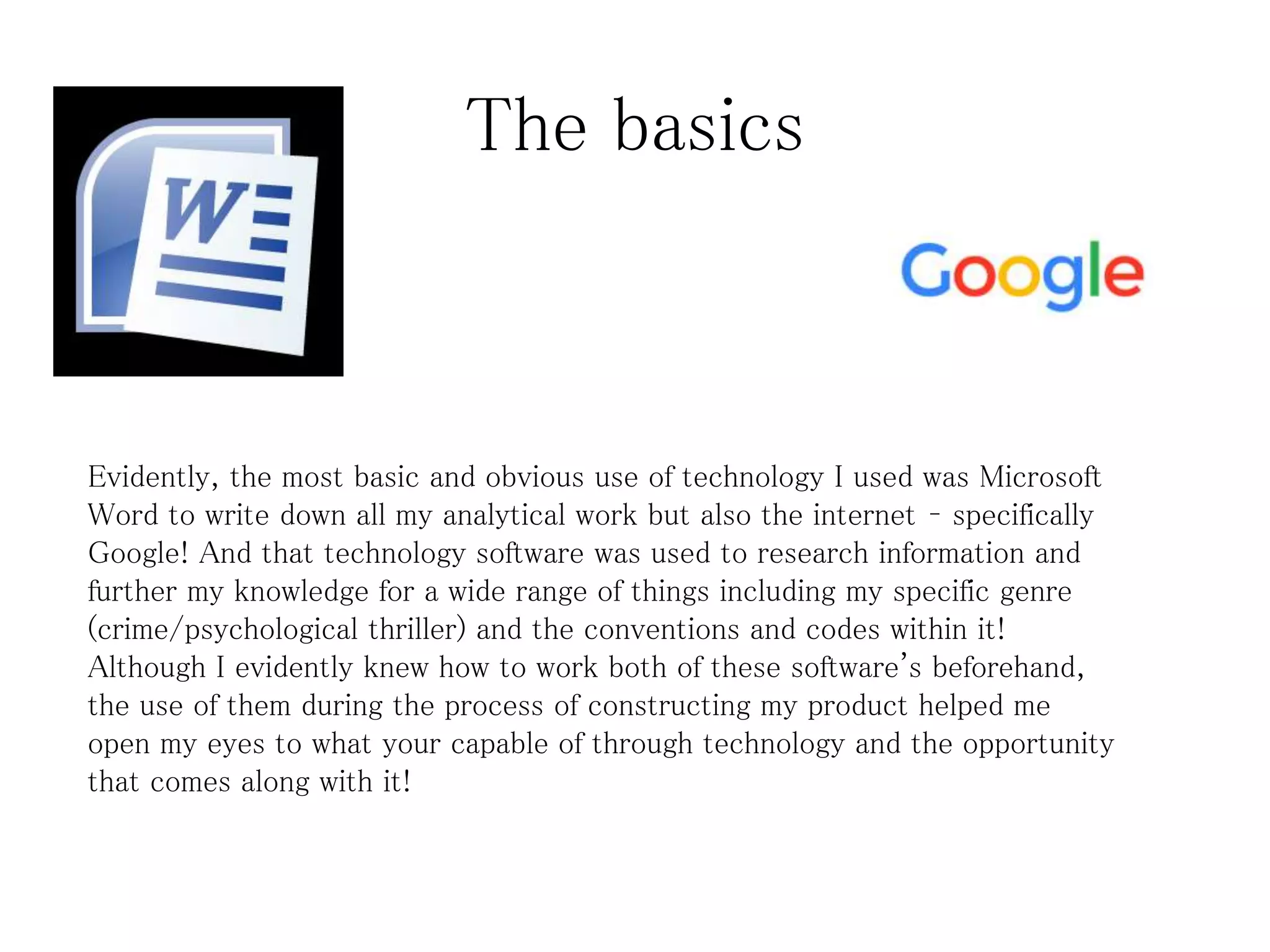 The document discusses the various technologies the author learned about and used during the process of constructing their media product. This included using Microsoft Word, Google, Blogger, SlideShare, Prezi, Tube Chop, Survey Monkey, a Sony camera, Final Cut Pro, Epidemic Sound, YouTube, and a memory stick. The author found that using these technologies enhanced their knowledge of digital tools and platforms, improved the quality and professionalism of their work, and helped develop their creativity. However, they also encountered some technical difficulties along the way which helped them learn.