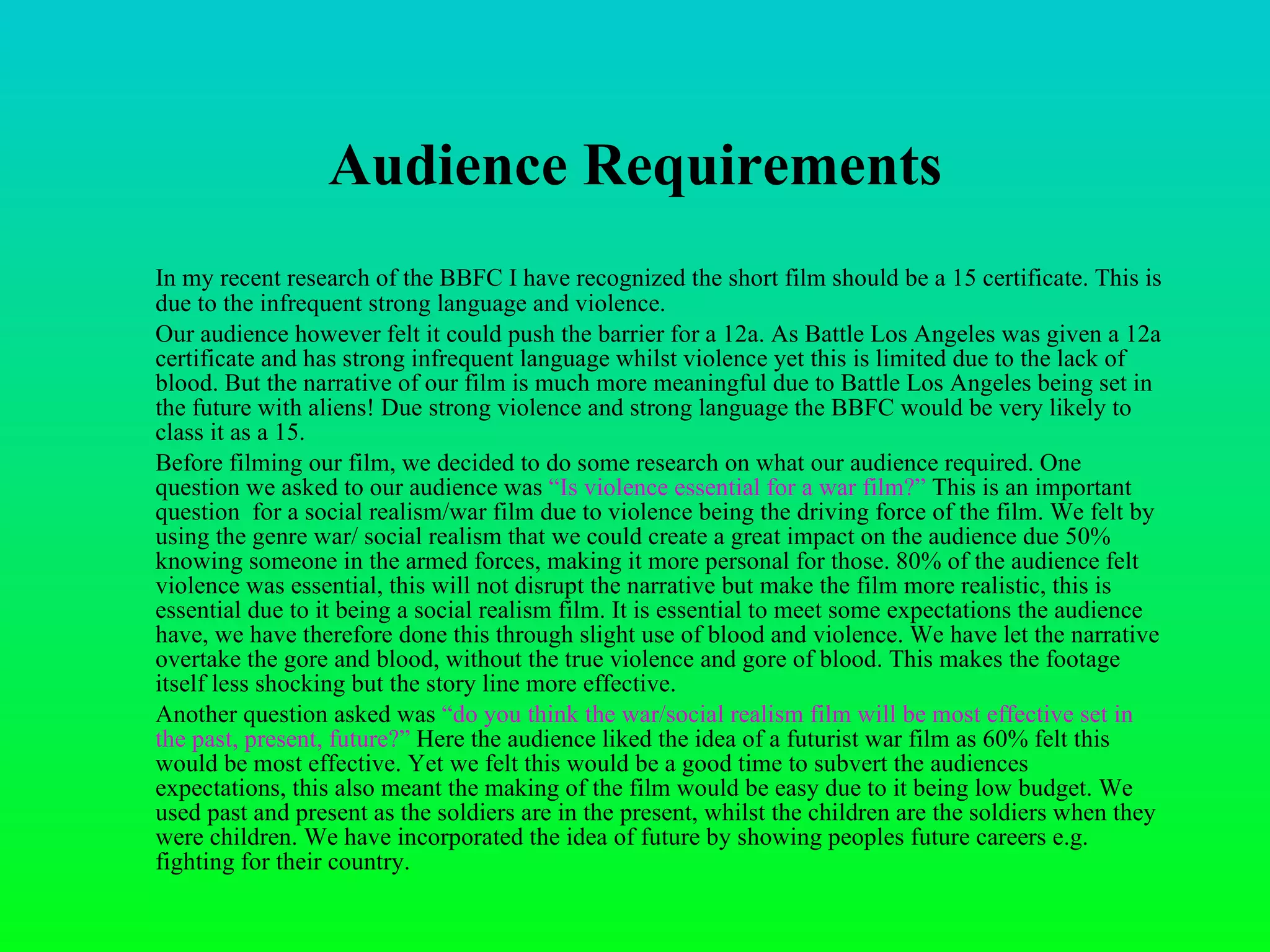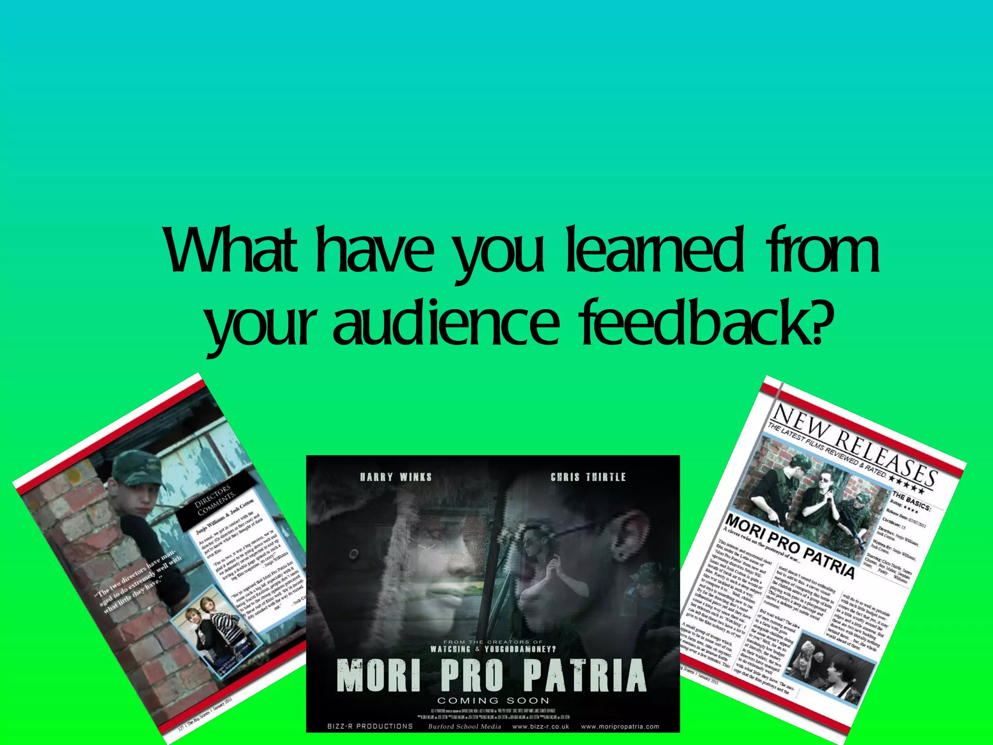 The document summarizes feedback received from test audiences on various drafts of a short war film and marketing materials. Audiences felt the film needed faster pacing and less long shots in early edits. They responded positively to stylistic choices like black and white filtering and sound design. The final poster draft addressed feedback to include more credits and indicate the Latin title's meaning. Research of successful films and magazines informed the filmmakers' design choices.