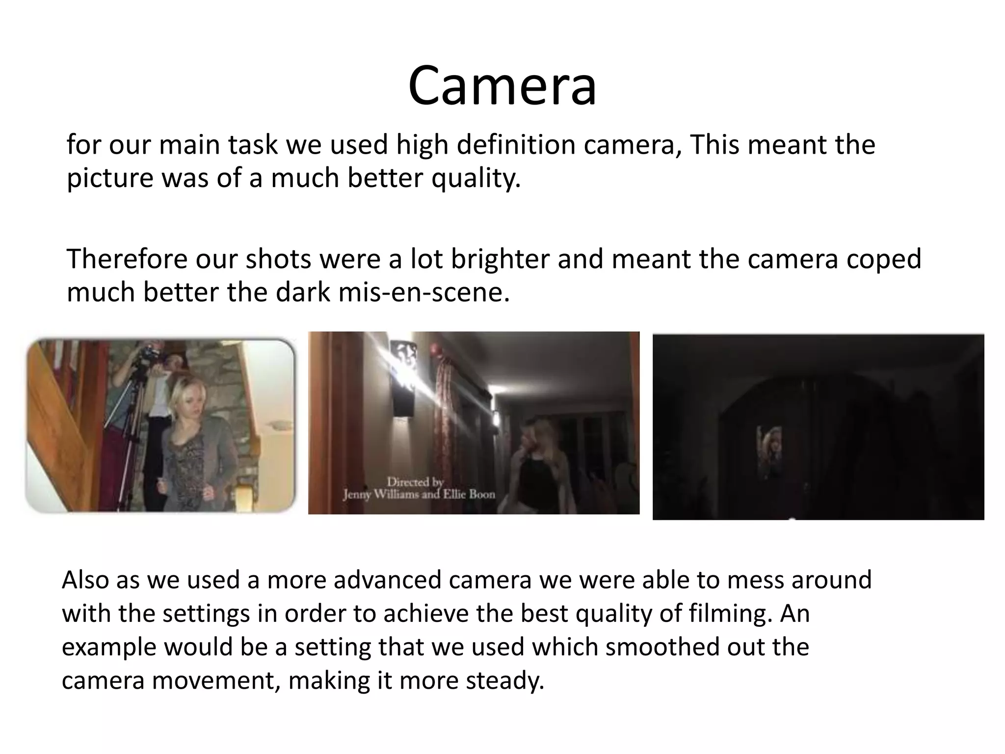 The document discusses various technologies used in constructing a video project, including a high-definition camera that captured better quality pictures and allowed adjusting settings, a microphone with a boom stick plugged into the camera to record audio, and Adobe Premiere Pro to edit shots, adjust audio levels, add transitions, and export the final video to YouTube.