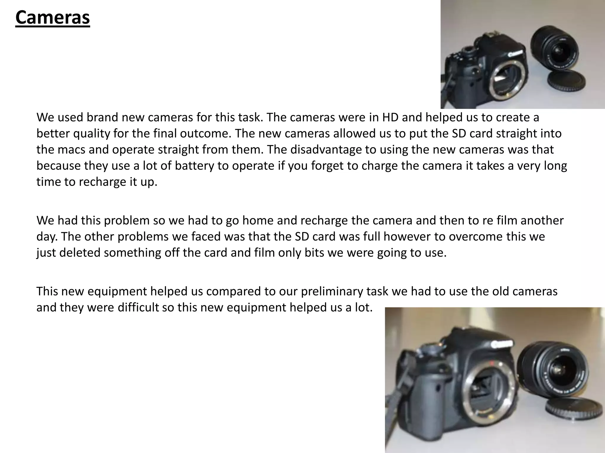 The document discusses the technologies used to create a film project. It summarizes the use of new HD cameras, tripods, dollies, iMacs for editing, lighting rigs, and software like iMovie and GarageBand. It describes how these tools helped capture better quality footage and create special effects, though some required troubleshooting issues like battery life, memory cards filling up, and bumpy movement on the dolly. The document evaluates how the new equipment helped improve the project compared to previous work with older cameras and limitations of the software.