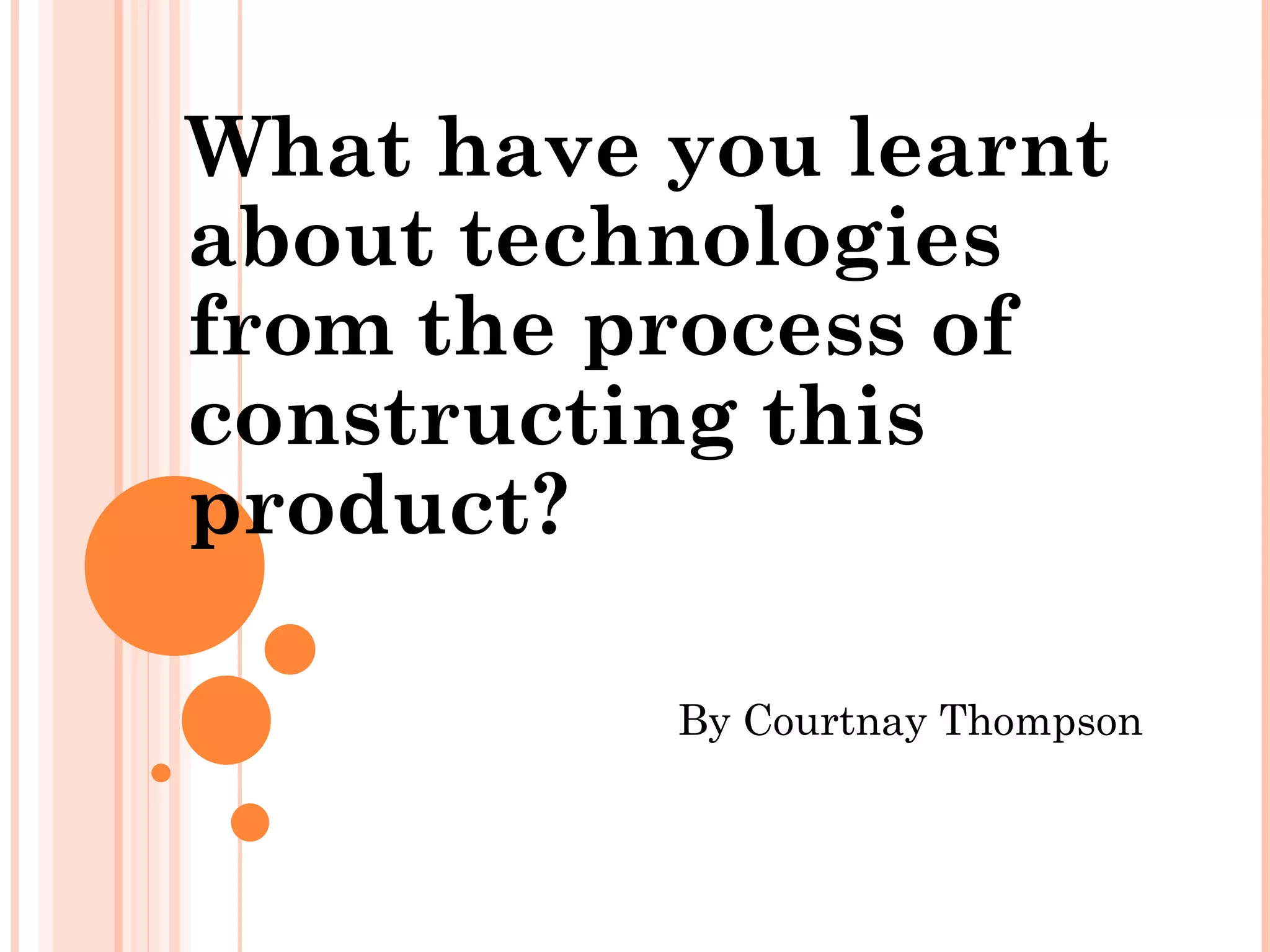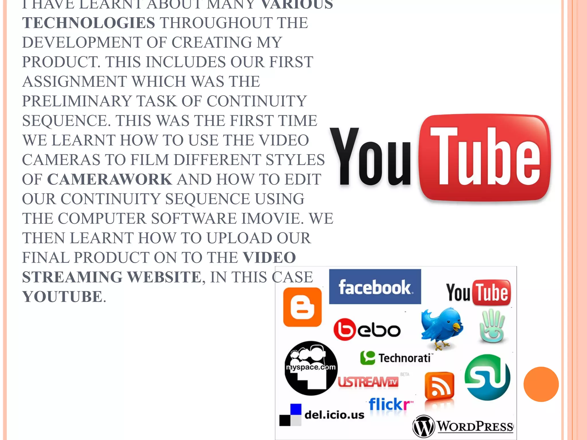 The student learned about various technologies through creating their product. This included learning how to use video cameras to film different styles and edit a continuity sequence using iMovie. They also learned how to upload the final product to YouTube. The student researched films using digital cameras, websites like YouTube, and iMovie to create a storyboard and animatic with still images and music. When filming, they used Panasonic video recorders and tripods to get different camera shots. Finally, they edited the final opening sequence in iMovie, adding credits, effects, titles and soundtracks.
