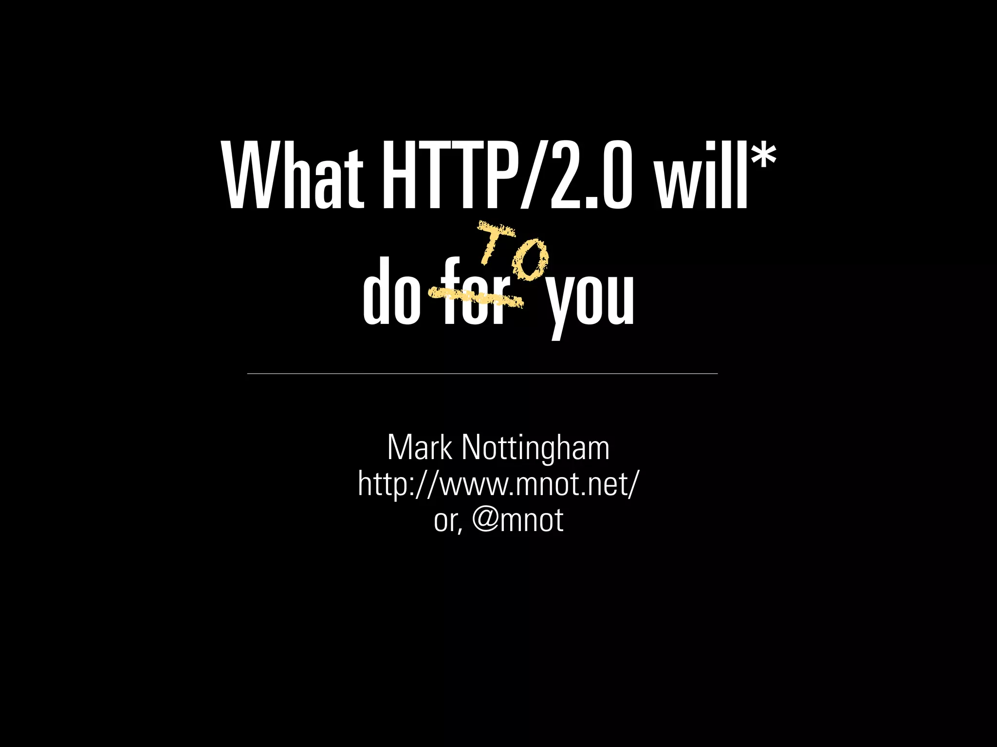 The document discusses the development and features of HTTP/2.0, which aims to enhance web performance without altering the core HTTP semantics. Key improvements include multiplexing, header compression, and potential server push capabilities, streamlining how requests are handled. Although designed to address performance and efficiency issues inherent in previous versions, challenges remain, particularly in security and TCP protocol limitations.