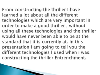 From constructing a thriller, the author learned about various important technologies. The author used YouTube to upload the thriller to their blogger and learned how useful YouTube is for sharing videos online. The author also learned to use blogger to share their work, which they now know how to use perfectly. The author discovered new software like Moby Gratis for finding free music, SlideShare for uploading slideshows, and Survey Monkey for gathering audience feedback. Overall, constructing the thriller helped the author develop skills using technologies like Apple computers, Final Cut Express for editing, cameras, tripods, and LiveType for titles, which were all essential to completing the project.