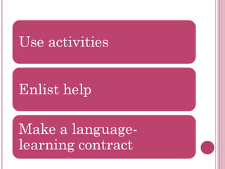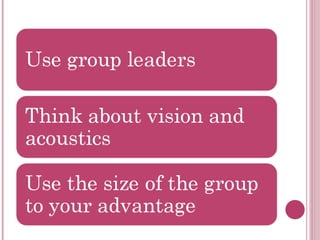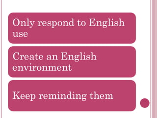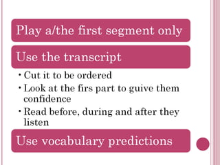 The document poses hypothetical challenges that may arise in a classroom such as students being at different levels, the class being large in size, students refusing to stop speaking their native language or being uncooperative. It also considers what may occur if students do not want to talk, do not understand listening exercises or finish activities at different paces than other groups. The document is asking the reader to consider these potential issues and have any questions addressed.