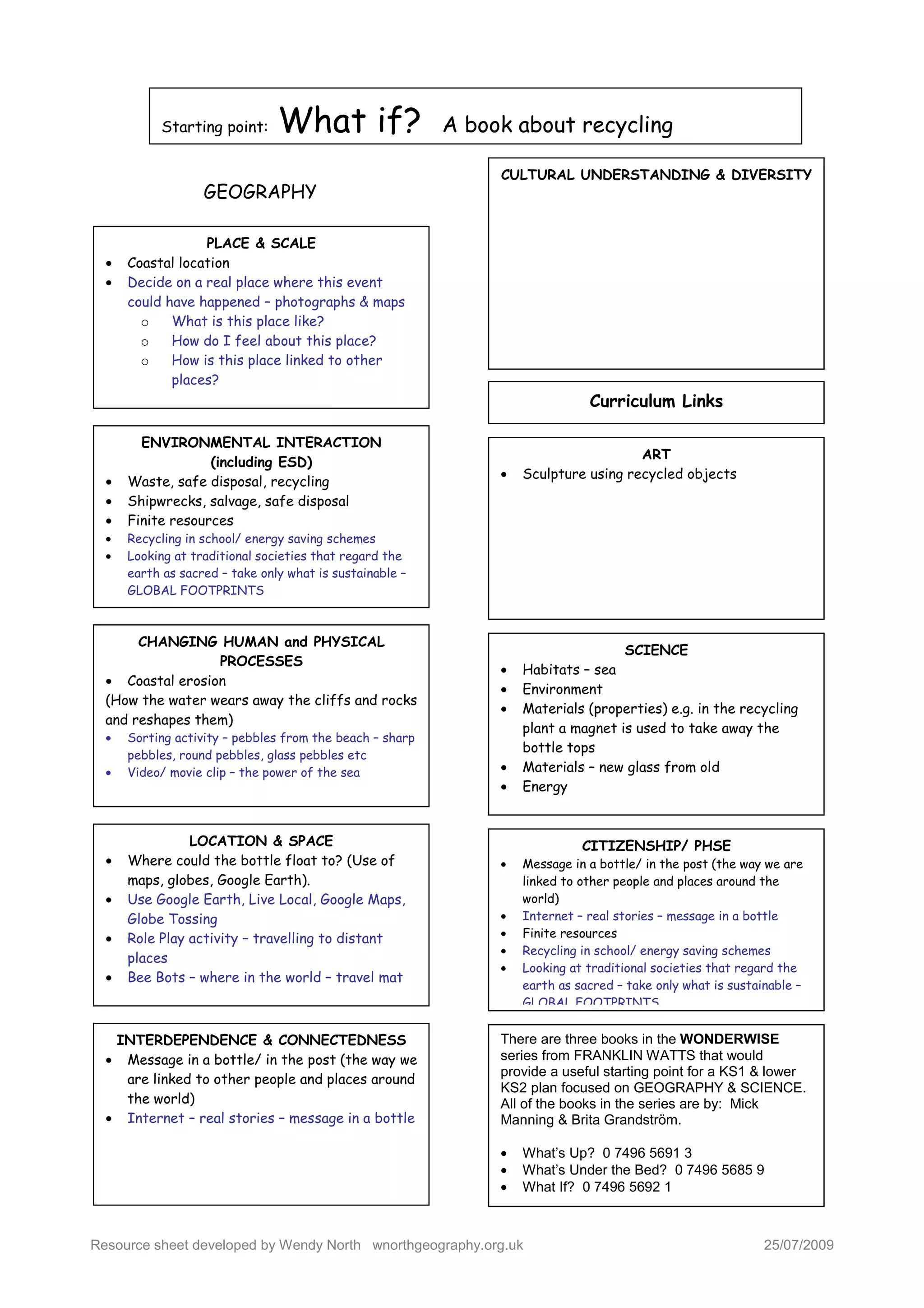 This document provides a suggested lesson plan about recycling centered around the book "What If? A book about recycling". The plan incorporates geography, science, art, and citizenship topics. It includes ideas for activities like sculpting with recycled objects, studying coastal erosion, and role playing traveling with recycled materials. The overall goal is to explore recycling and sustainability through the lens of a fictional story.