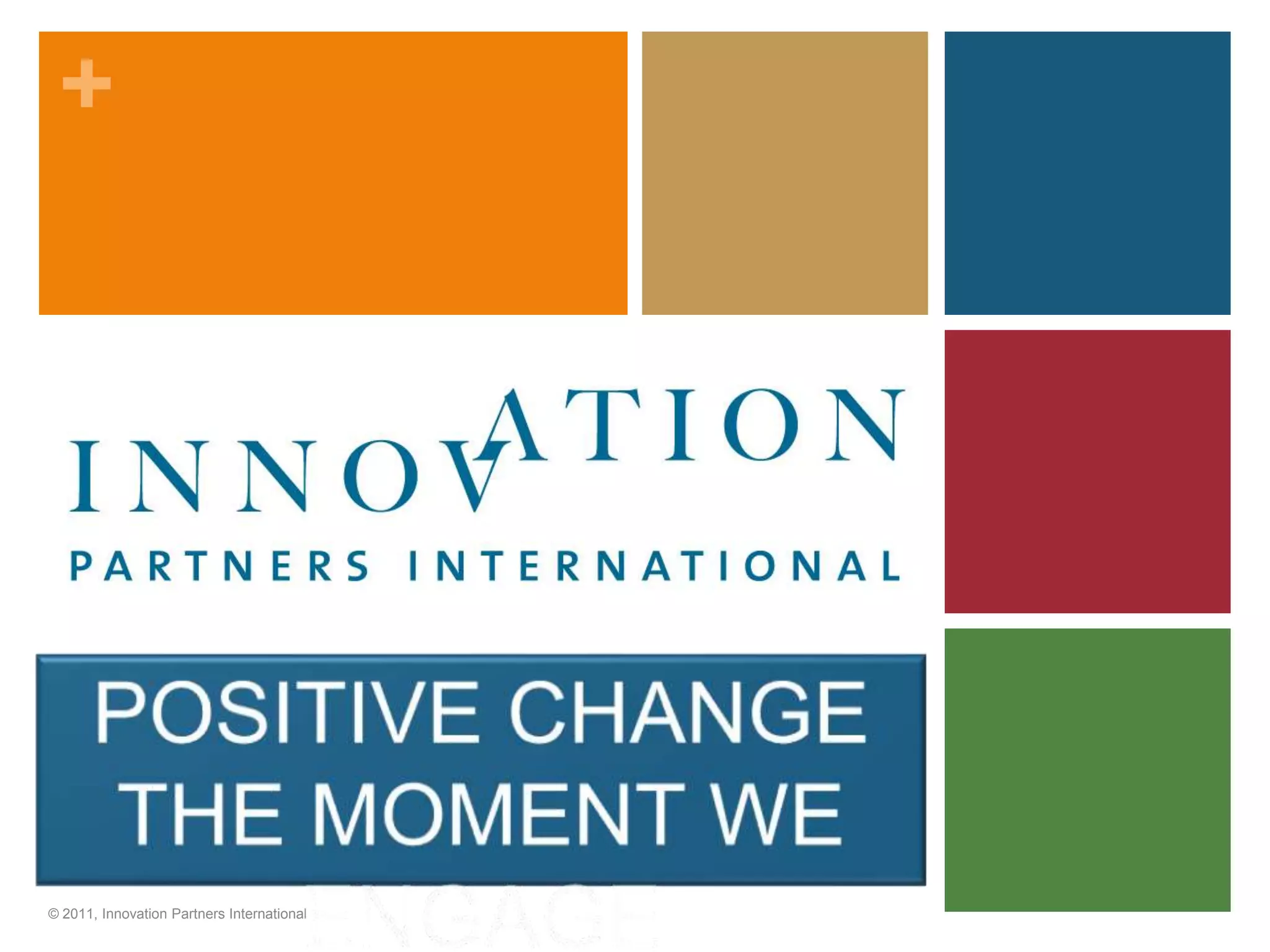 Innovation Partners International focuses on co-creating positive change by engaging the whole system and building on strengths. They utilize appreciative inquiry and strength-based processes to foster high stakeholder engagement and uncover innovative opportunities. Their model aims to achieve lasting results for individuals and organizations, ultimately leading to improved bottom lines.