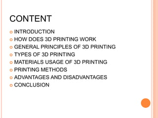 The document provides a comprehensive overview of 3D printing, detailing its principles, methods, types of printers, and applications across various industries, including medical and automotive. It discusses the materials used, the advantages and disadvantages of the technology, as well as predictions for its future impact on commerce and manufacturing. Additionally, it emphasizes the importance of CAD modeling and repair processes in creating 3D-printed objects.
