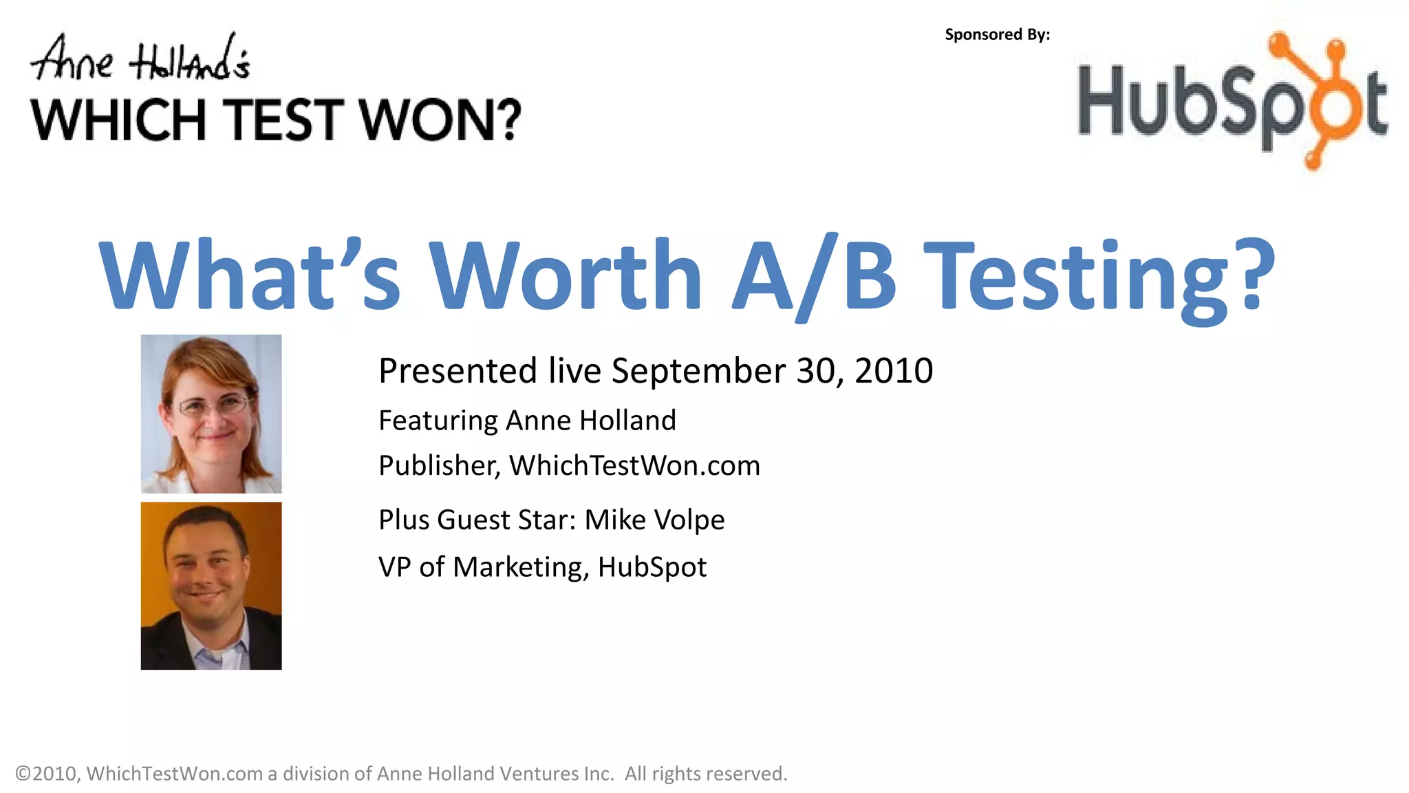 This document summarizes a presentation about A/B testing web pages. It discusses why companies should test pages rather than relying on assumptions, and which pages and elements are most worthwhile to test, such as lead generation forms, buttons, headlines and images. It provides examples of tests that increased conversions by 30-125%. It also offers guidelines for testing, such as running tests for 1-2 weeks with at least 500 visitors, and convincing executives by focusing on return on investment. The presentation was given by Anne Holland and Mike Volpe to marketers.