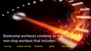 Fuel Your Training in Northbrook, IL offers boot camp workouts that combine running, weight training, and core strength for an intense, full-body workout. The program promotes affordability, diversity, and camaraderie while addressing lifestyle issues like nutrition and self-motivation, resulting in improved fitness and a sense of accomplishment. The facility is equipped with the latest equipment, showers, and a massage area.