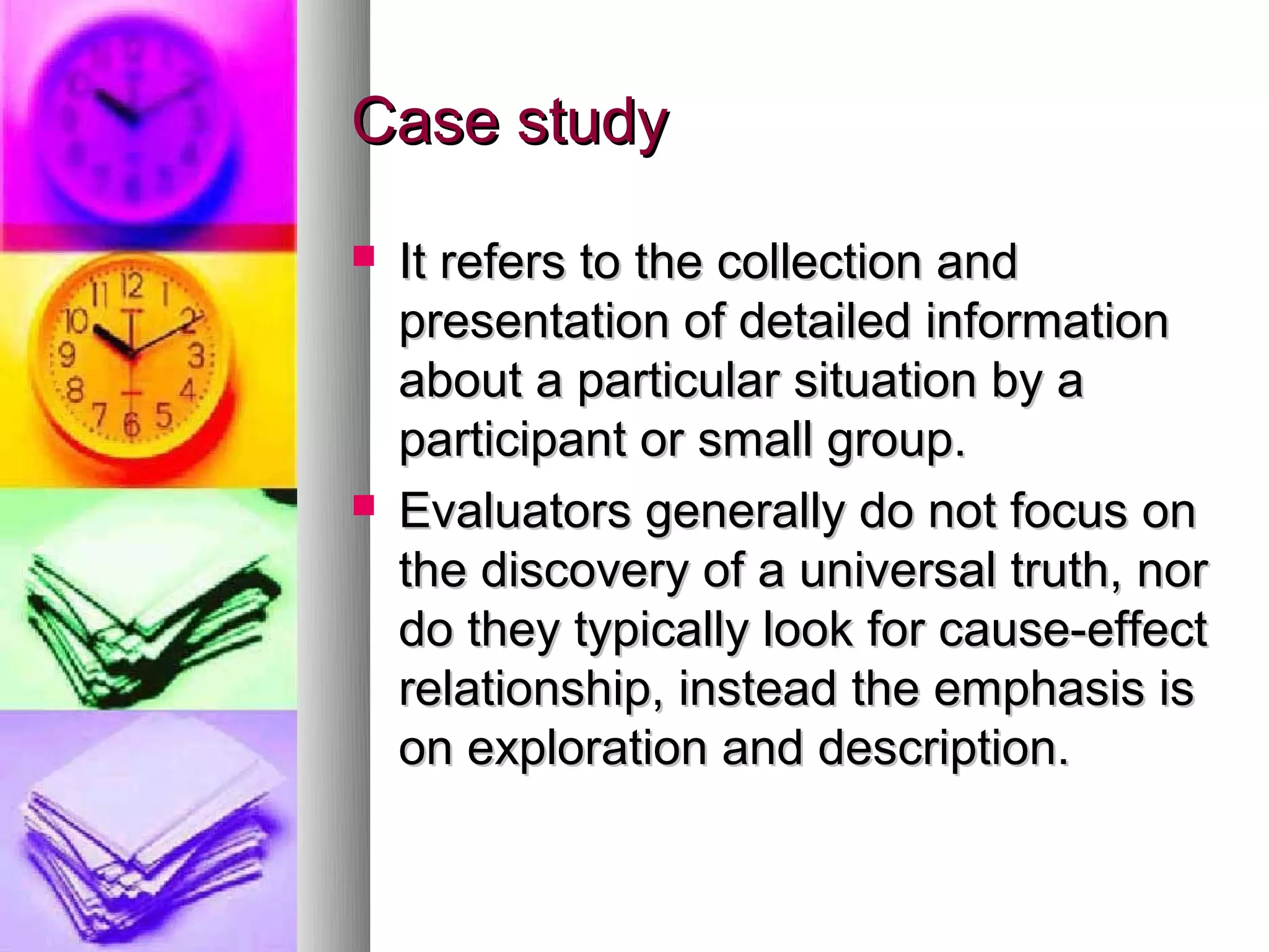A case study involves the collection and presentation of detailed information about a particular situation or small group. It focuses on exploration and description rather than discovering universal truths or cause-effect relationships. The case method of learning presents students with real-world scenarios and allows them to problem solve by placing themselves in a decision-making role. This helps develop management skills like decision-making, analysis, and problem-solving. Analyzing case studies involves thoroughly reading the case, defining the key issues and goals, identifying constraints, exploring alternatives, selecting the best alternative, and developing an implementation plan. Written case studies follow a standard format including an executive summary, problem statement, alternatives analysis, conclusion, and implementation plan.
