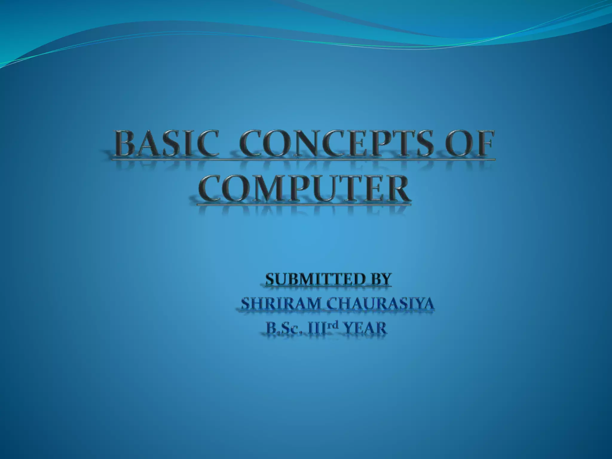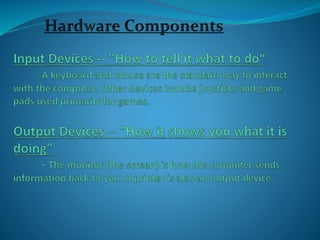 An electronic device that can be programmed to store, process, and retrieve data is called a computer. It consists of both hardware and software and comes in various sizes. Common computer components include input devices like keyboards, mice, and scanners; output devices like monitors, printers, and speakers; storage devices like hard drives, diskettes, and CDs; and memory chips. The central processing unit (CPU) is the computer's main chip and determines processing speed. Popular operating systems include Windows and software applications are used to perform tasks like word processing, spreadsheets, databases, and presentations. Computers are widely used both professionally and personally for activities like accounting, games, education, banking, identification, retail, teleworking, and