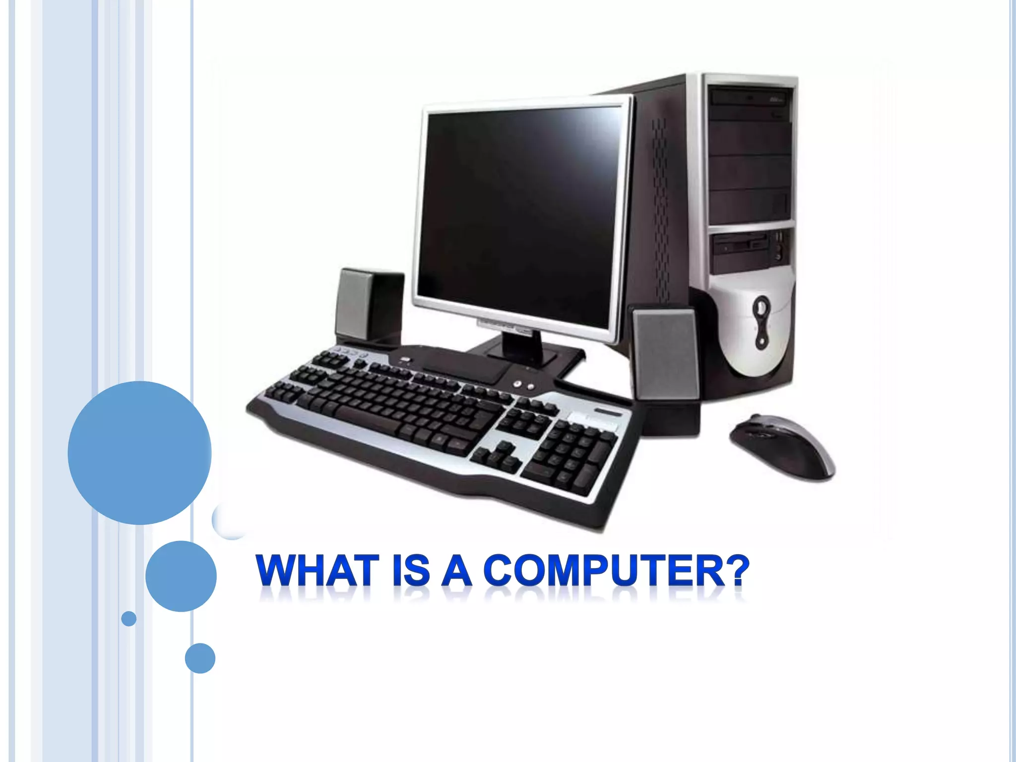 A computer consists of three main elements - the system unit, input devices, and output devices. The system unit contains the central processing unit and memory which process data. Common input devices include keyboards, mice, and scanners which allow users to input information. Popular output devices are monitors, printers, and speakers which display or present the processed data. Peripheral devices like CD drives, modems, and flash drives can also be connected to enhance the computer's functions. Proper keyboarding technique and care of computer equipment help ensure its safety and longevity.