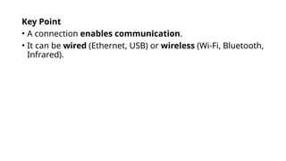 A connection is a link between two or more devices that allows them to communicate, share data, or access resources.
