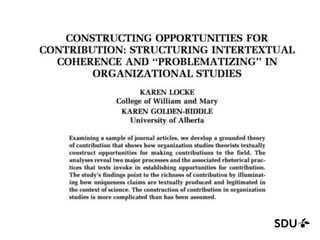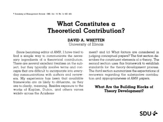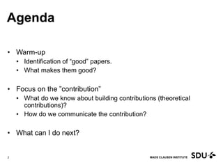 The document outlines themes from a PhD workshop focusing on building theoretical contributions in research. It discusses the characteristics of good research papers, the importance of theoretical contributions, and methods to communicate these effectively. Various insights and examples are provided to illustrate how to craft impactful contributions while considering the relevance and interest within the academic field.