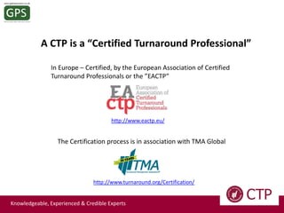 A Certified Turnaround Professional (CTP) is recognized for expertise in corporate renewal, having undergone a rigorous certification process by the European Association of Certified Turnaround Professionals (EACTP). The CTP designation signifies a high standard of professionalism and ethical practices in the turnaround industry, establishing credibility for both the certified individuals and their clients. Becoming certified requires substantial experience, passing exams, and demonstrating competency, providing professionals with a competitive edge in the field.