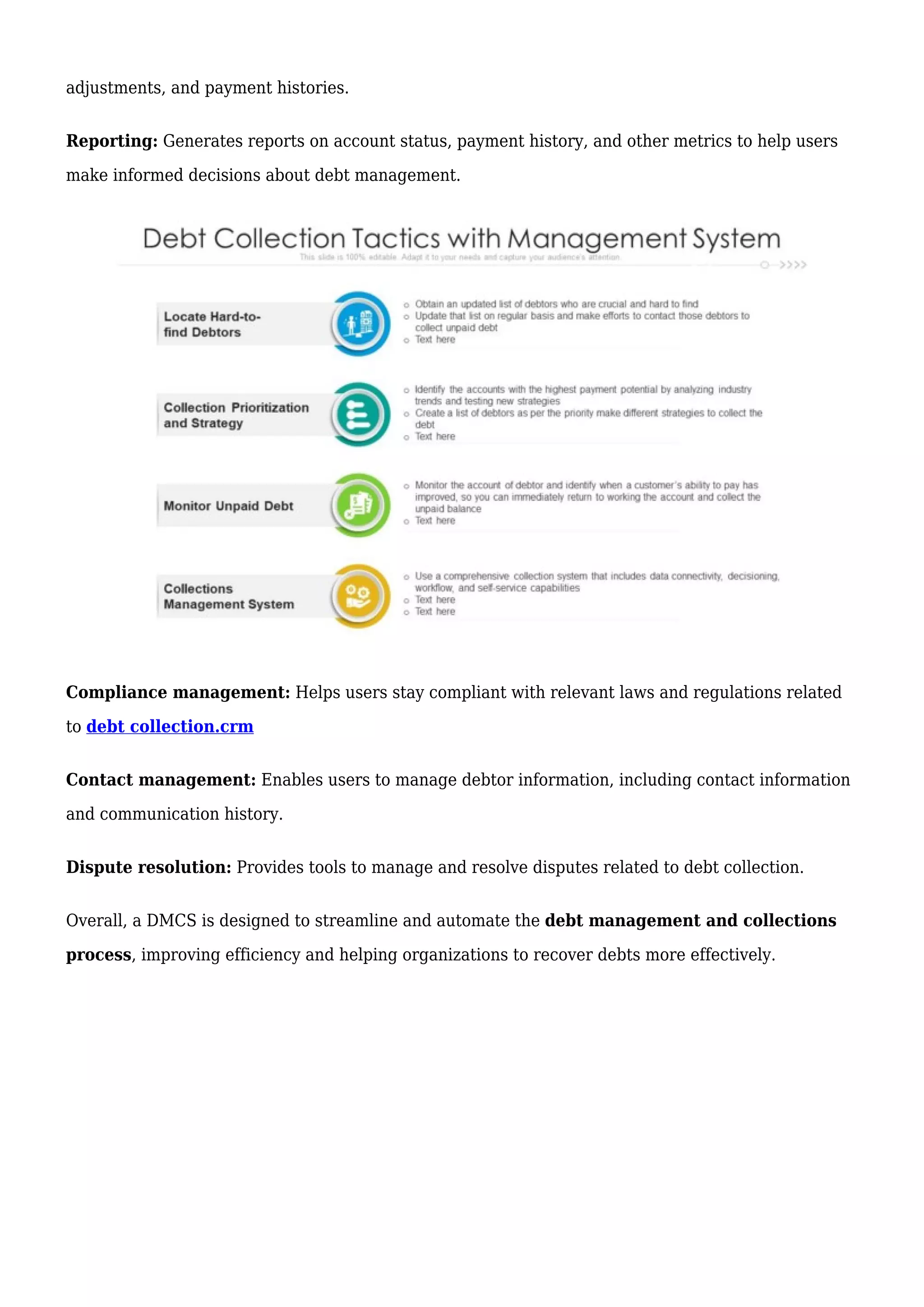 A Debt Management and Collections System (DMCS) is software that helps organizations manage debts, accounts receivable, and collection activities. Key features include payment processing, automated reminders, account management, reporting, compliance management, CRM contact management, and dispute resolution. The system aims to streamline the debt collection process, enhancing efficiency in recovering debts.