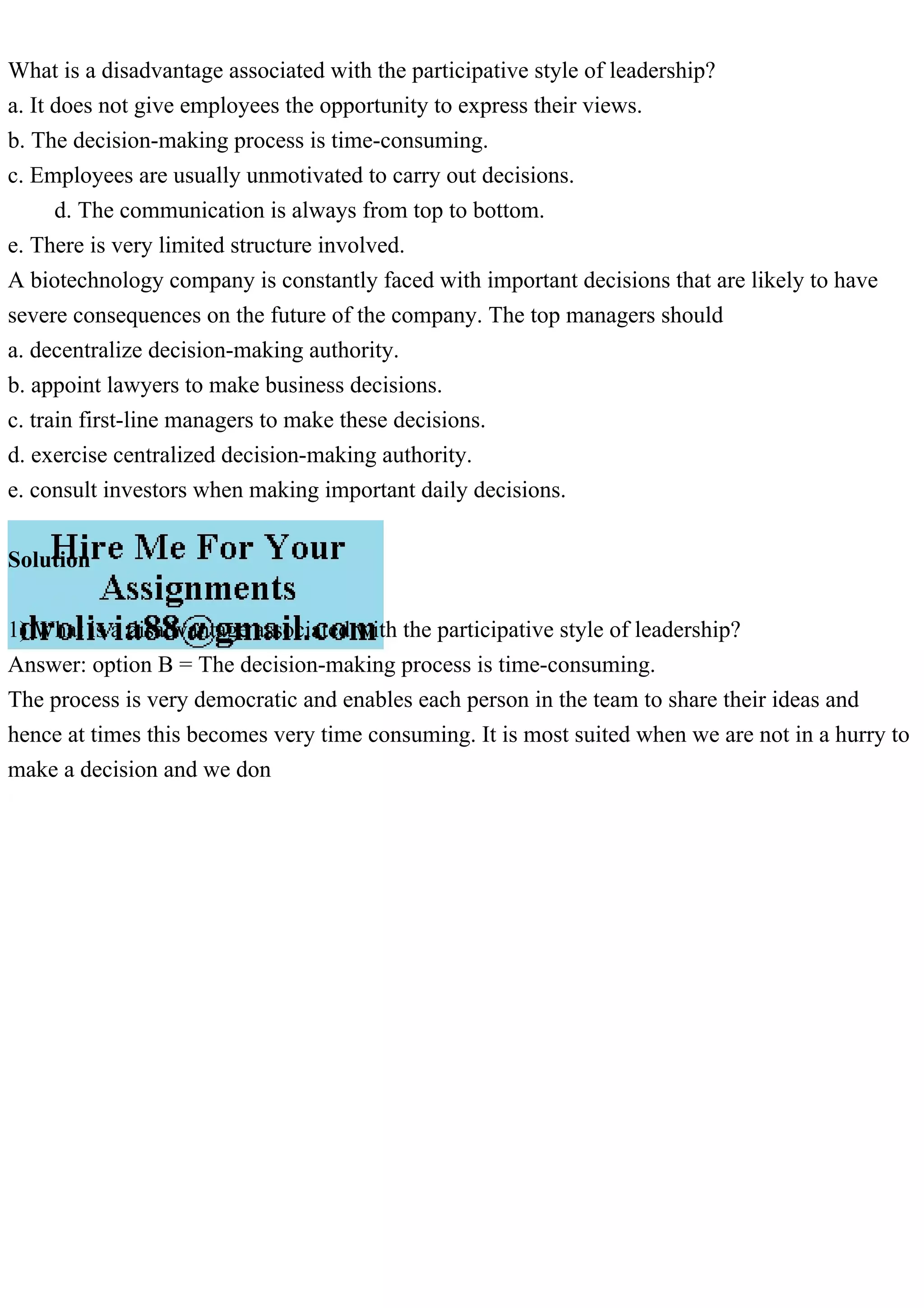 The document discusses the disadvantages of the participative leadership style, highlighting that the decision-making process can be time-consuming. It presents a scenario in a biotechnology company where top managers face important decisions and suggests various approaches to decision-making. Option b is identified as a key disadvantage, pointing out that the democratic nature of participative leadership can slow down the process.