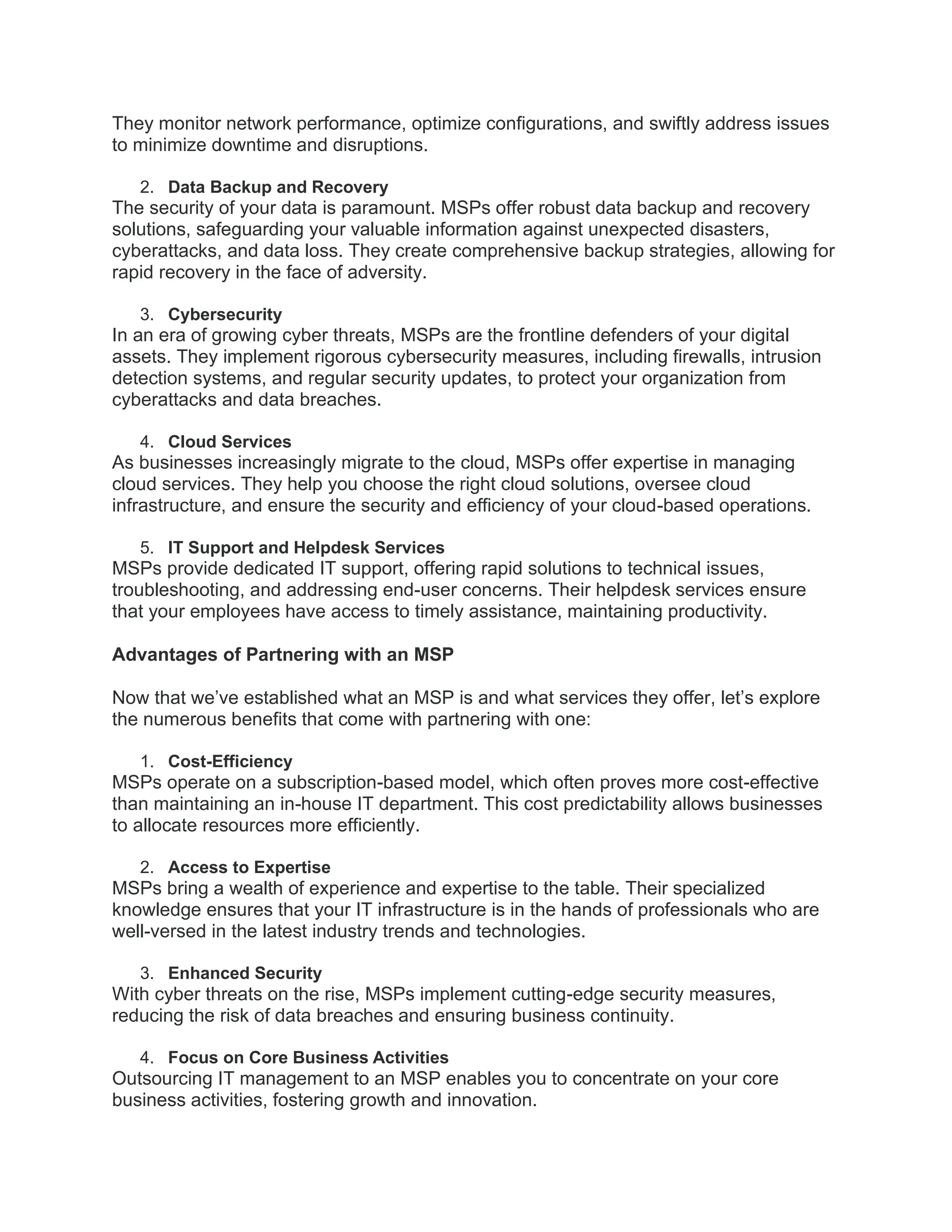 A Managed Service Provider (MSP) is a specialized organization that manages IT services, including network infrastructure, data backup, cybersecurity, cloud services, and IT support, for businesses. By partnering with an MSP, companies can enhance efficiency, benefit from expert knowledge, reduce costs, and focus on core activities. Selecting the right MSP involves evaluating their reputation, service offerings, security measures, service level agreements, and pricing.