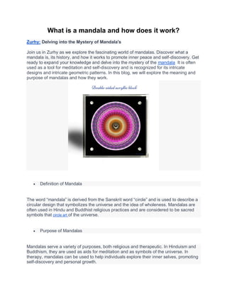 The document explores the concept of mandalas, which are circular designs symbolizing the universe and wholeness, deriving from Sanskrit. Often used in Hindu and Buddhist practices, as well as in therapy, mandalas aid meditation, promote self-discovery, and bring balance to the mind and body. It emphasizes that creating mandalas can be a therapeutic experience that enhances personal growth and understanding of one's emotions.