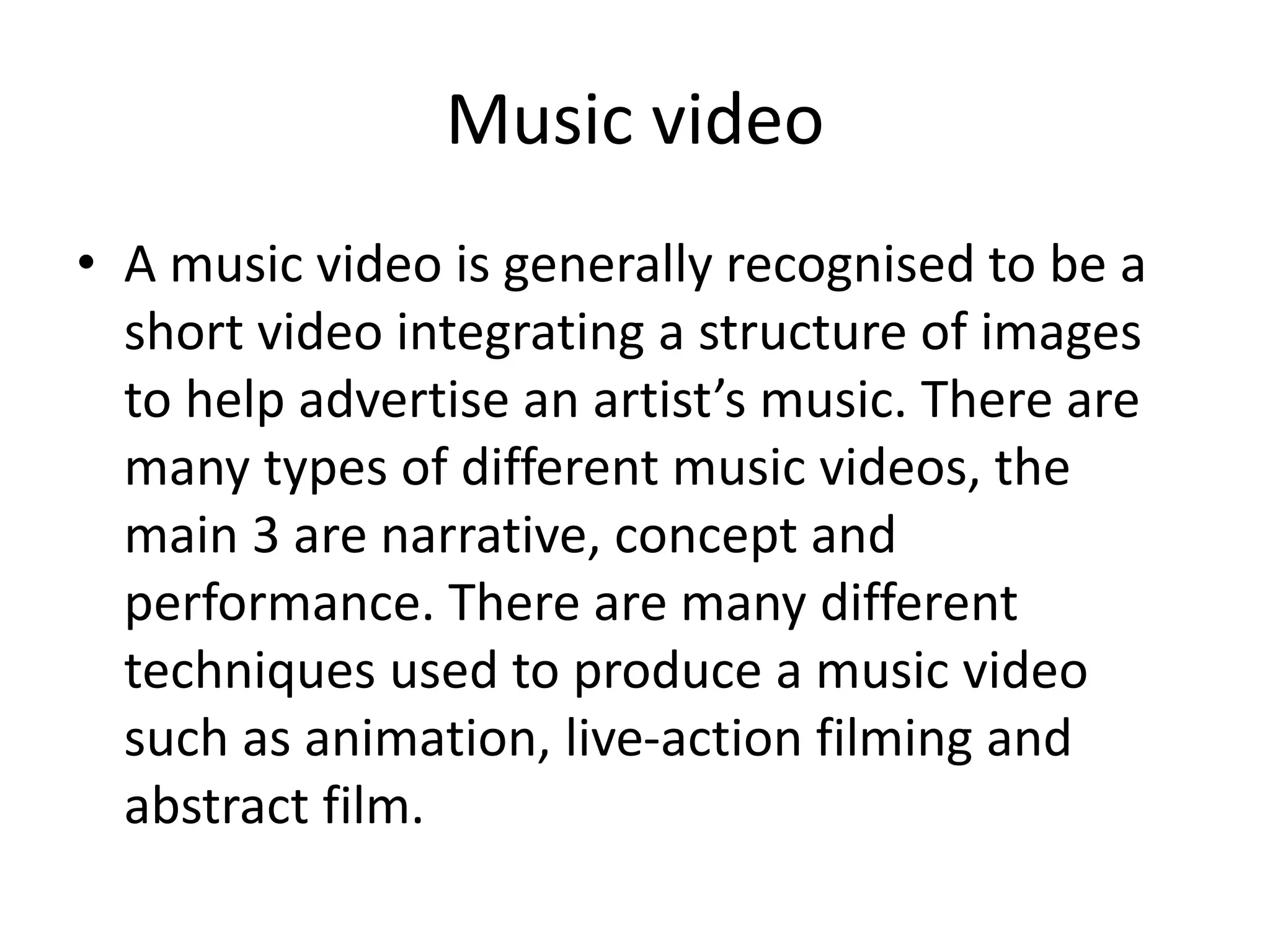 A music video is generally a short video that integrates images to promote an artist's music. There are three main types of music videos: narrative videos, which tell a story that reflects the song's lyrics; concept videos, which have unusual or surreal themes; and performance videos, which feature the artist performing the song live for the camera. Music videos are typically used to advertise a song and create buzz around the artist by telling compelling stories or being controversial to gain attention. Narrative videos simply follow a story line that matches the lyrics, while concept videos aim to keep viewers engaged with abnormal themes, and performance videos provide an intimate live experience.