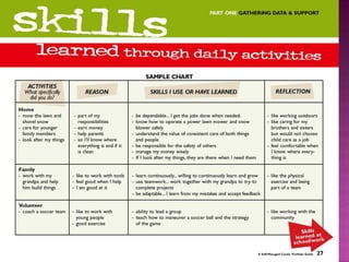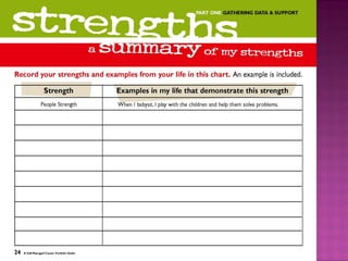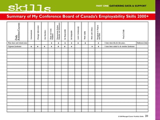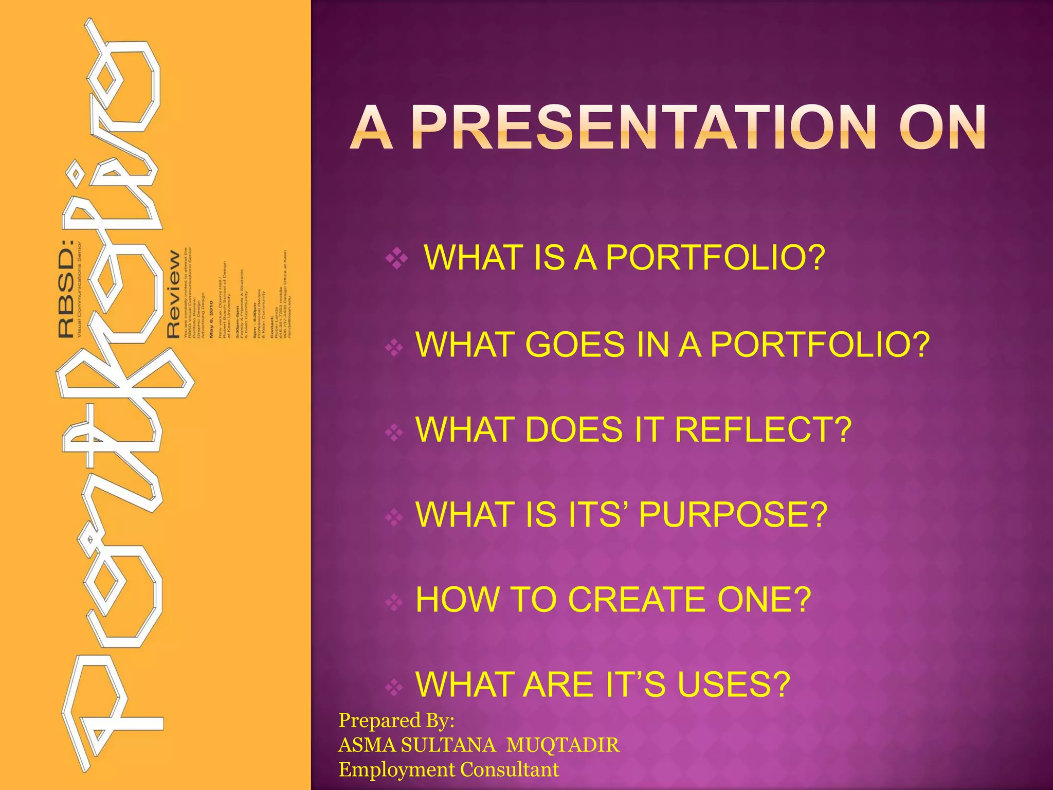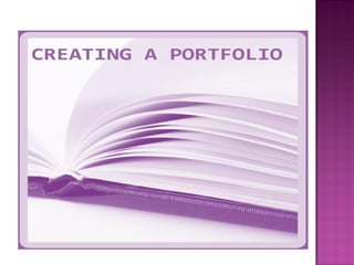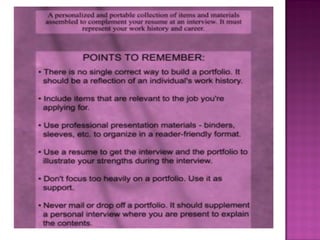 This document discusses what a portfolio is, what it contains, its purpose, and how to create one. A portfolio is a collection of an individual's work and qualifications used to demonstrate skills and accomplishments to potential employers or educators. It typically includes resumes, reference letters, reports, certificates and other documents. The purpose is to highlight one's interests, skills, abilities, values and education. To create a portfolio, one identifies strengths, gathers evidence of accomplishments, and assembles materials in a organized binder for review during interviews to showcase relevant qualifications and skills.