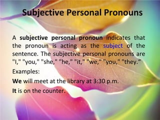 A pronoun can replace a noun and makes sentences less repetitive. There are different types of pronouns including personal pronouns that change form based on person, number, gender, and case. Other pronoun types are possessive, demonstrative, interrogative, indefinite, and reflexive pronouns.