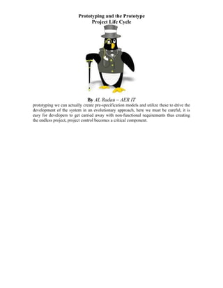 A prototype is a live, data-driven model that is capable of evolving through user interaction with system designers. Prototyping is used when requirements cannot be fully specified up front, such as with historical data or emerging technologies, as users can state goals and objectives but are unclear on how to accomplish them. Prototyping incorporates a learning process into system design, resulting in improved quality, higher user satisfaction, and shorter development times compared to the classical waterfall methodology. It allows creating preliminary models to drive evolutionary development, though project control is critical to avoid endless projects from non-essential requirements.