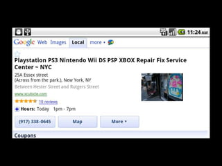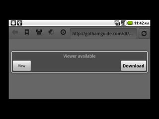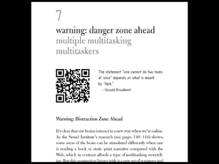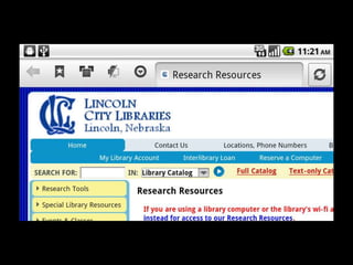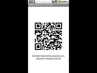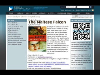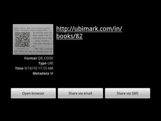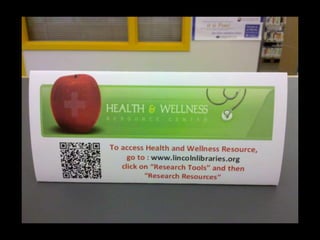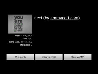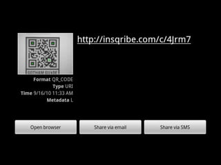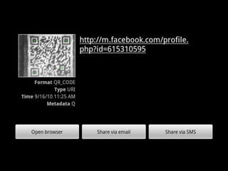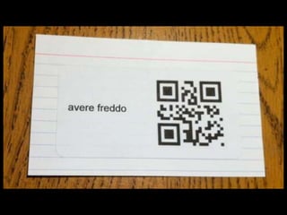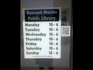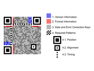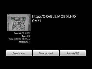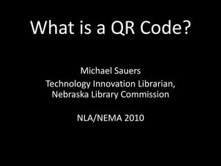 QR codes are matrix barcodes that can be read by smartphones and stored various data like text and URLs. They have more data capacity than traditional barcodes. Users need a smartphone with a camera and QR code reader software to scan and interpret QR codes. Examples of how libraries can use QR codes include providing hours, branch locations, call numbers, tours and art descriptions. There are several free online generators that can be used to create QR codes.