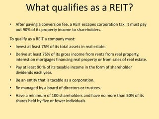 A REIT, or Real Estate Investment Trust, is a company that owns and operates income-producing real estate or real estate related assets. REITs allow individual investors to earn income from commercial real estate ownership without having to purchase properties directly. REITs invest in real estate properties or mortgages/mortgage securities tied to properties, generating income through rent collection or interest payments. To qualify as a REIT, a company must invest at least 75% of its assets in real estate, derive at least 75% of its income from real estate, and pay out at least 90% of its taxable income as dividends.