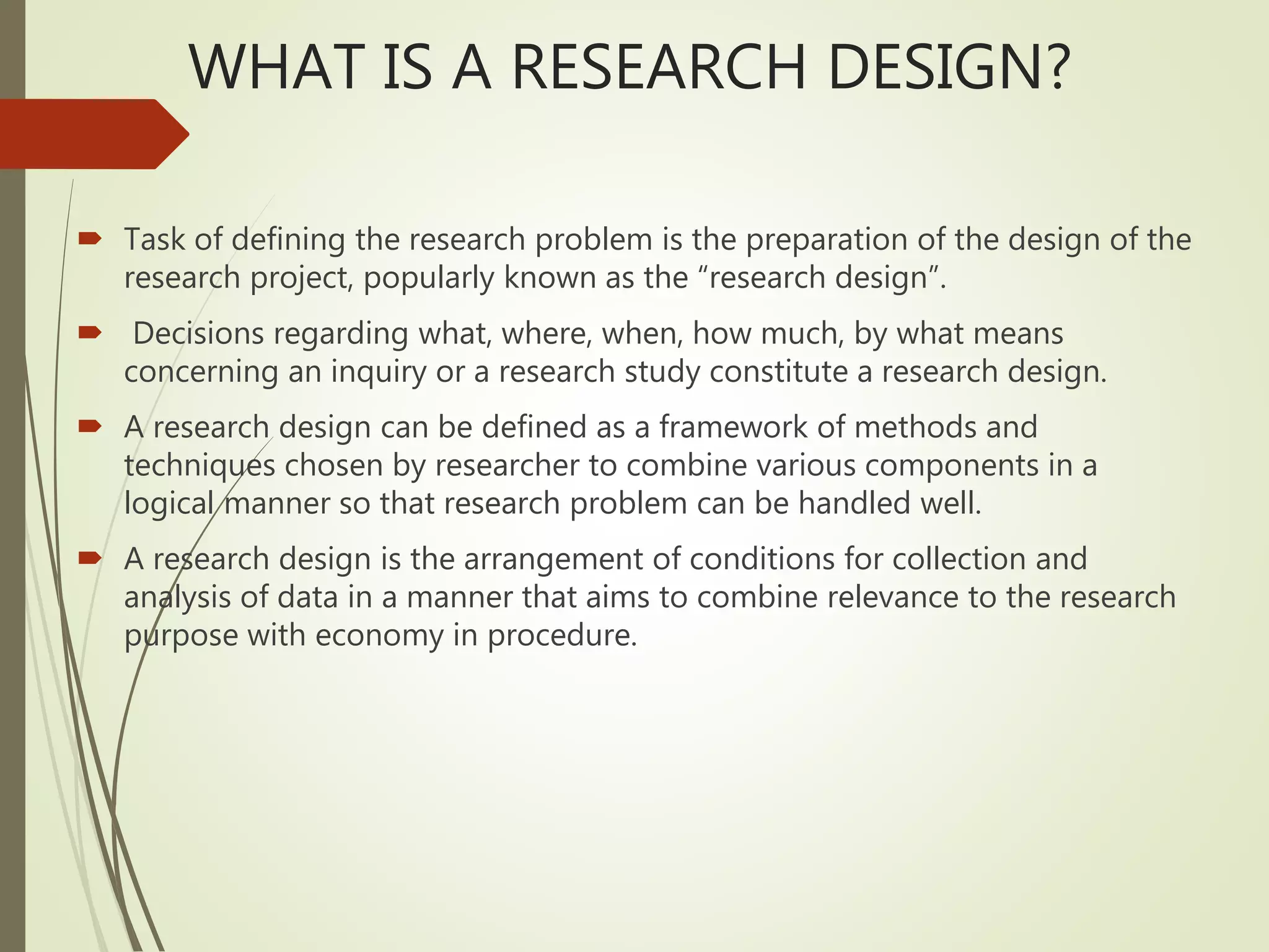 The document provides an overview of different types of research designs including experimental, quasi-experimental, ex-post facto, correlational, and their key features. Experimental designs aim to test hypotheses and establish causation through random assignment and manipulation of independent variables. Quasi-experimental designs are similar but do not use random assignment. Ex-post facto designs examine causes of effects that have already occurred. Correlational designs measure relationships between non-manipulated variables. Different designs have advantages for different research questions depending on feasibility and need for control.