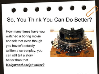 This document serves as a beginner's guide to screenplay writing, covering essential elements such as structure, character development, and the difference between screenplay and novel writing. It provides tips to overcome common challenges like writer's block and emphasizes the importance of creating relatable characters through imaginative descriptions. The guide encourages aspiring writers to take action and offers resources for further assistance.