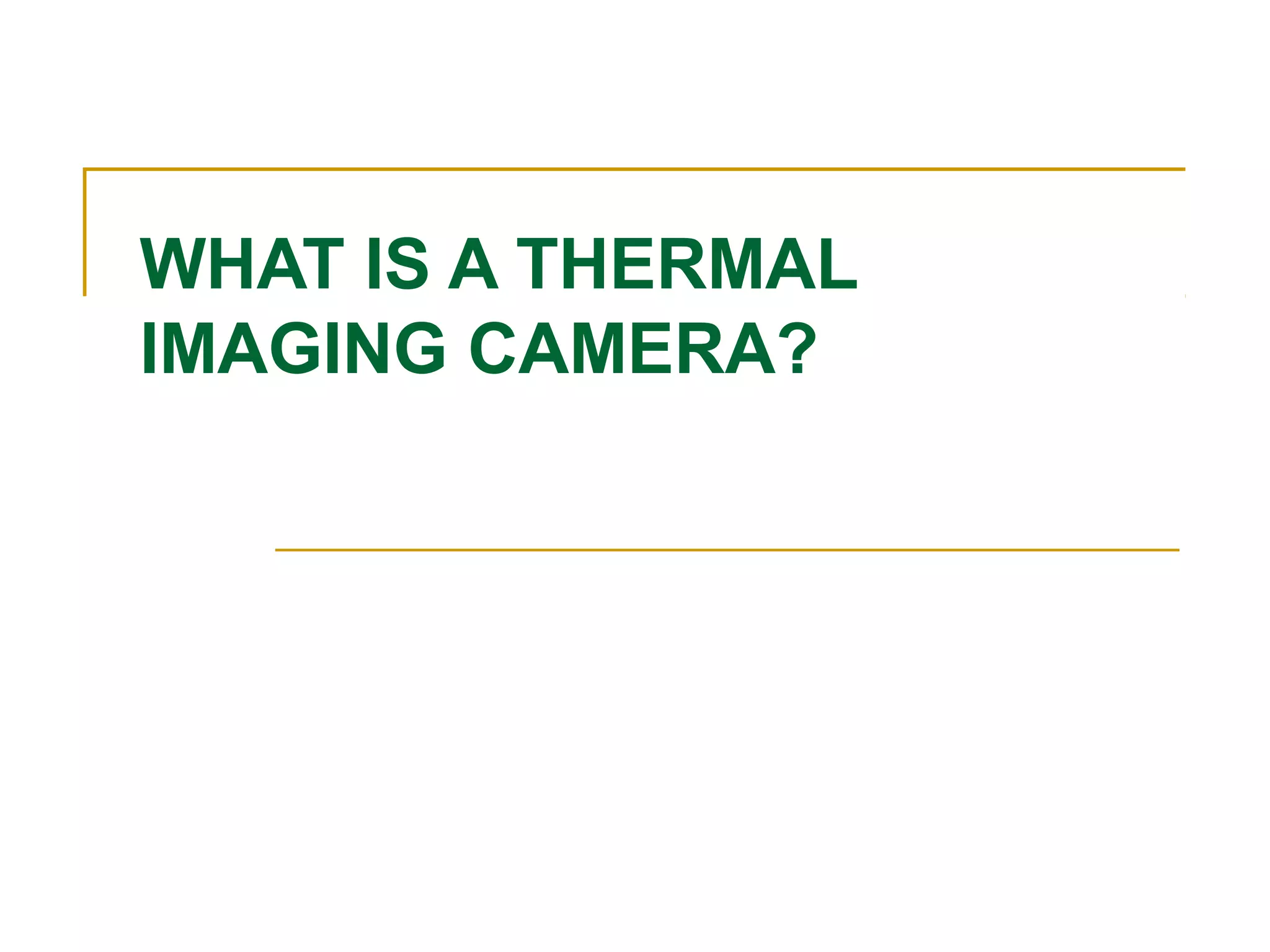 A thermal imaging camera is a thermographic device used to measure surface temperature differences, aiding in the identification of fire hazards and visualizing heat through infrared rays. It is designed for handheld use or can be helmet-mounted, constructed from heat and water-resistant materials, and features a display for real-time infrared output. Applications include helping firefighters locate sources of fire, inspecting electrical systems, and detecting thermal patterns in various settings.