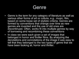 1) The document discusses the genres of horror and thriller films, analyzing conventions commonly used in each genre.