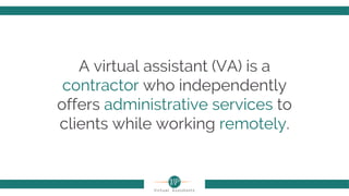 A virtual assistant (VA) is an independent contractor providing remote administrative services, with increasing demand due to the rise of remote work. Essential skills include effective communication, motivation, and discipline, with common services offered being general administration, content writing, and digital marketing. Starting a VA business requires identifying services and pricing, and can lead to a successful career if approached with consistency.